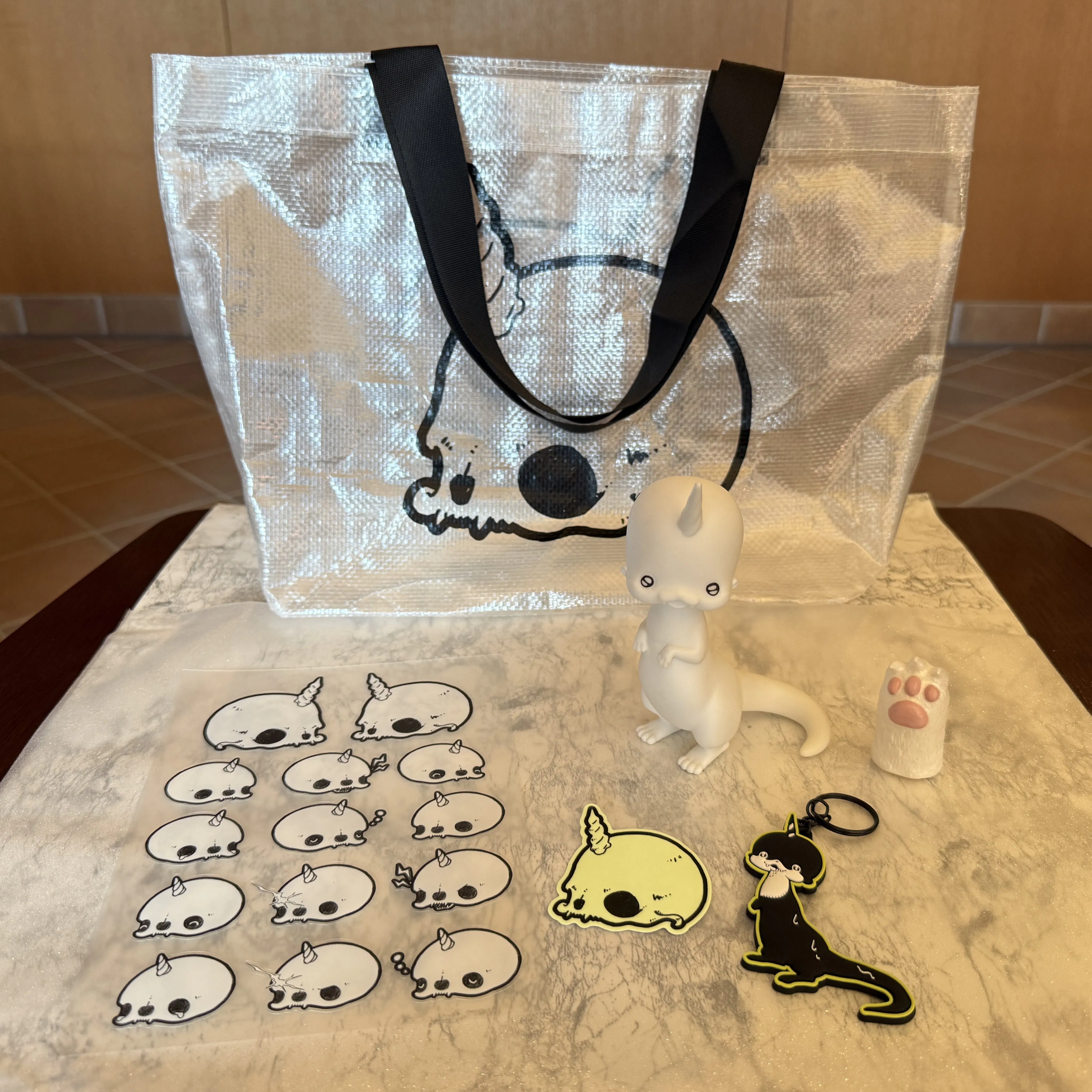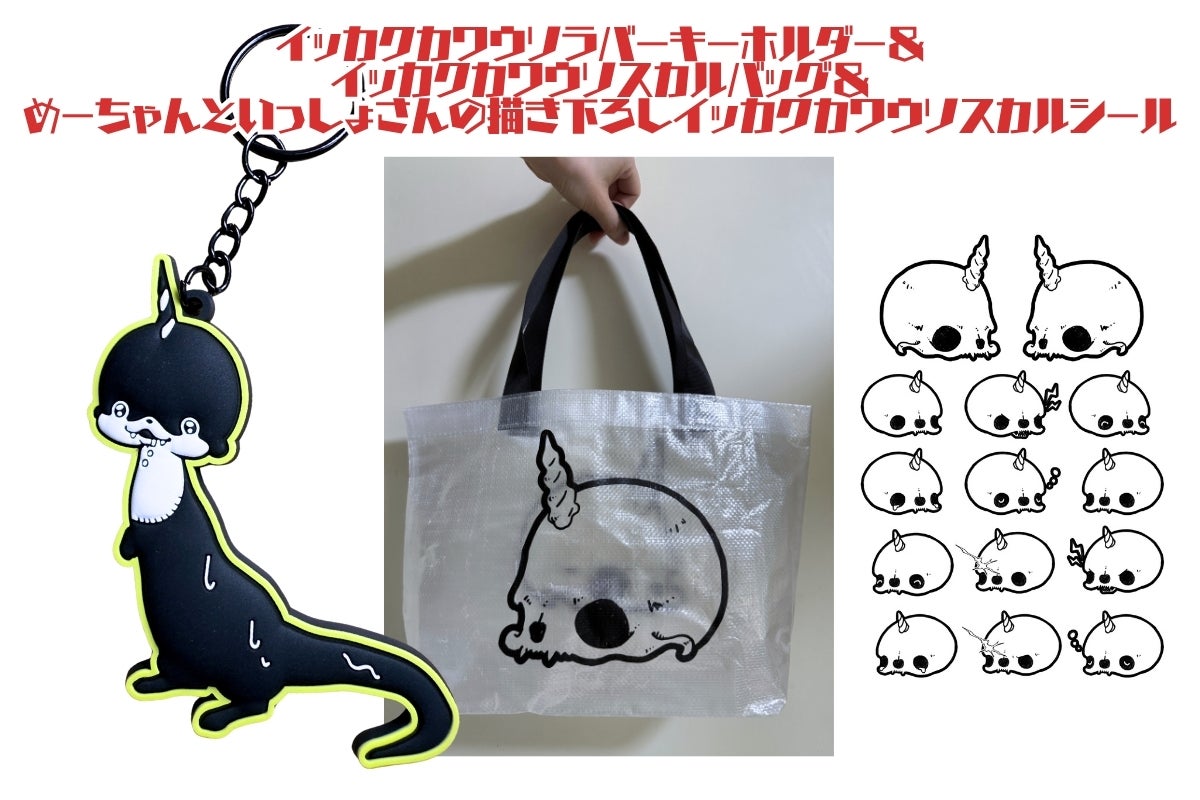 内容:ラバーキーホルダー1点+「イッカクカワウソ」スカルバッグ1点+めーちゃんといっしょさんの描き下ろし「イッカクカワウソ」スカルシール1枚