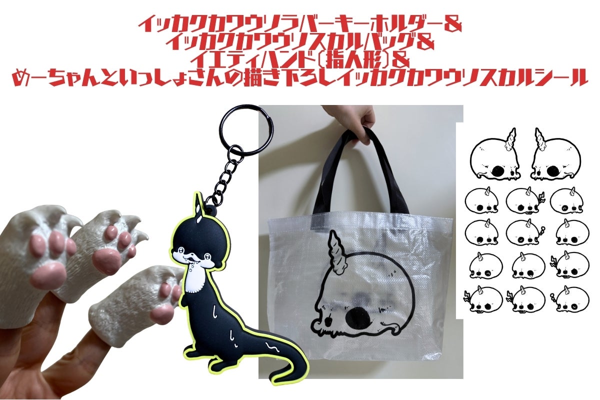 + 「イッカクカワウソ」ラバーキーホルダー1点 + イエティハンド(指人形)1点 +「イッカクカワウソ」スカルバッグ1点 + めーちゃんといっしょさんの描き下ろし「イッカクカワウソ」スカルシール2枚