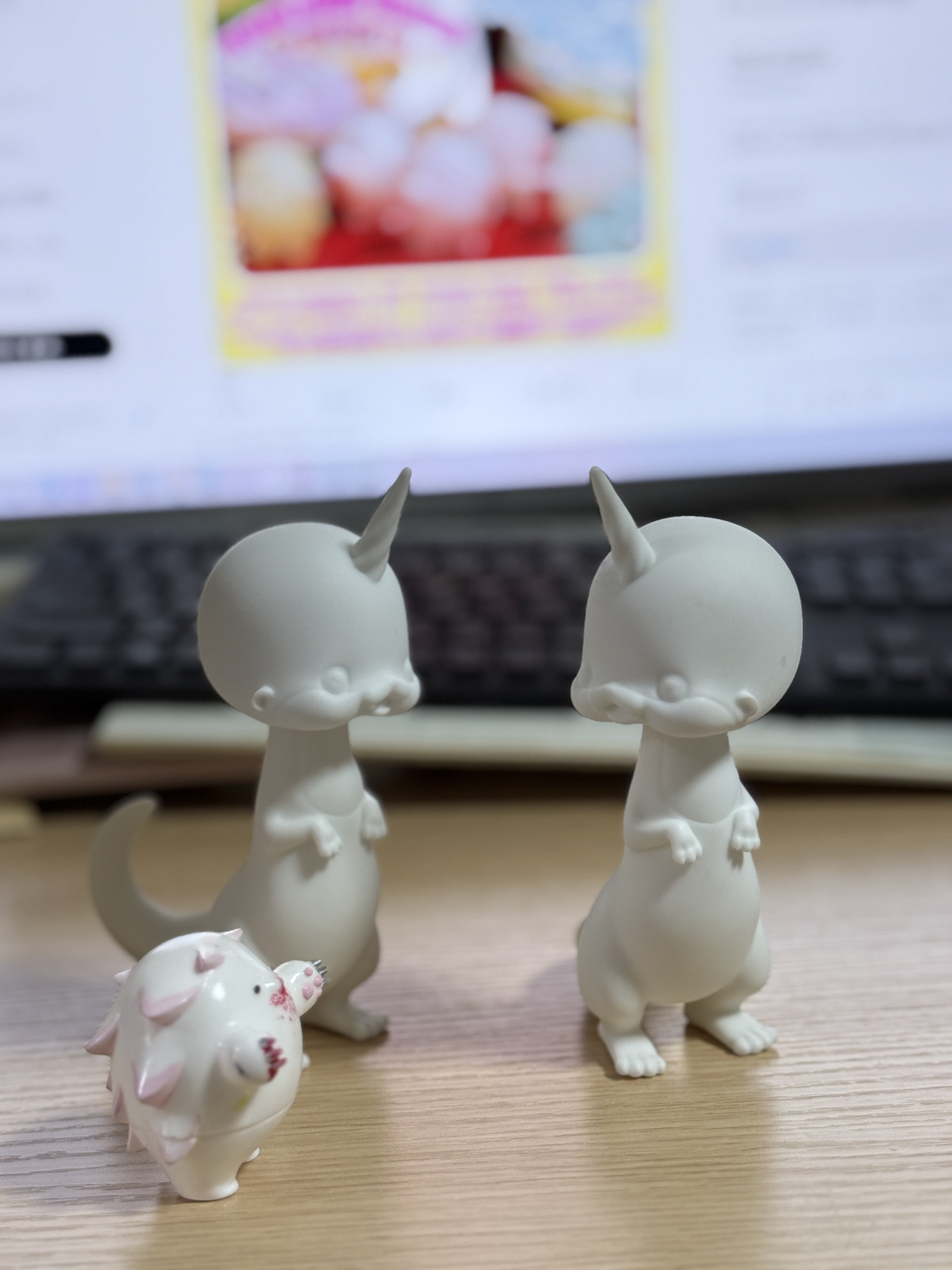 金型第一弾による「イッカクカワウソソフビ」成形見本と「ジャイアントデスイエティ」が仲良くしている様子です■余談