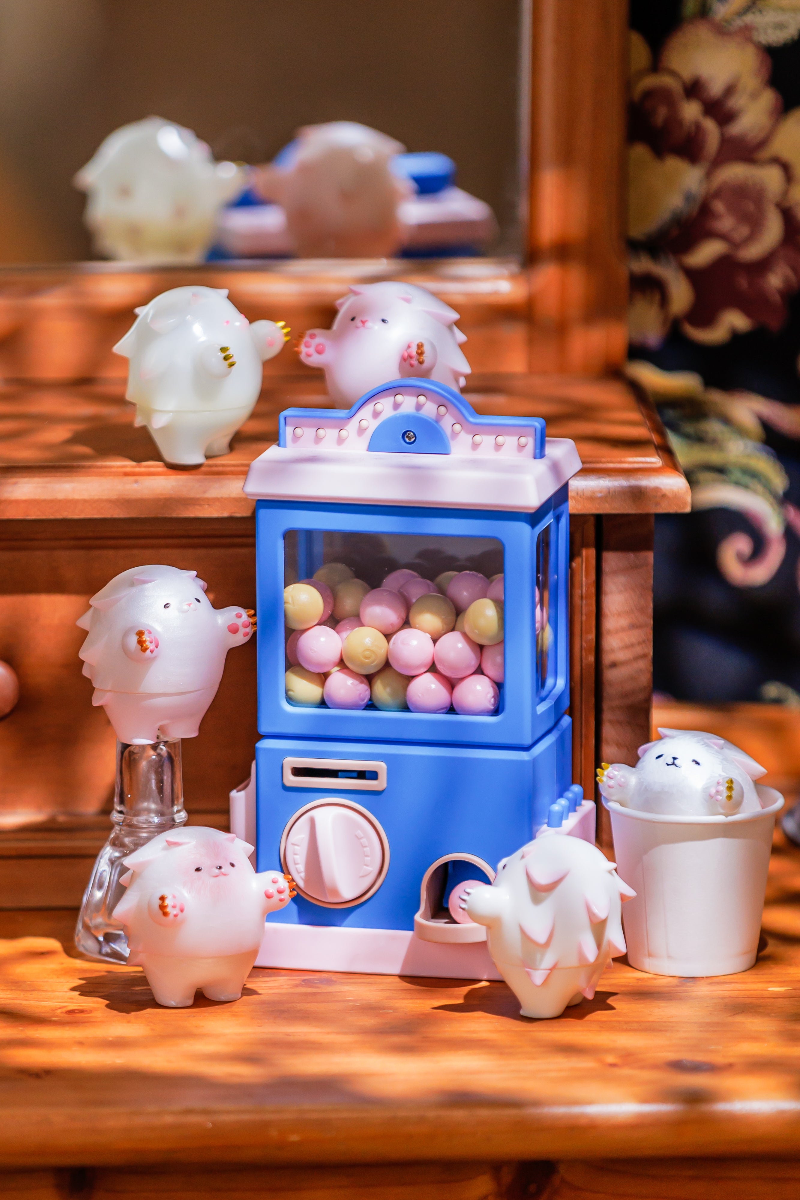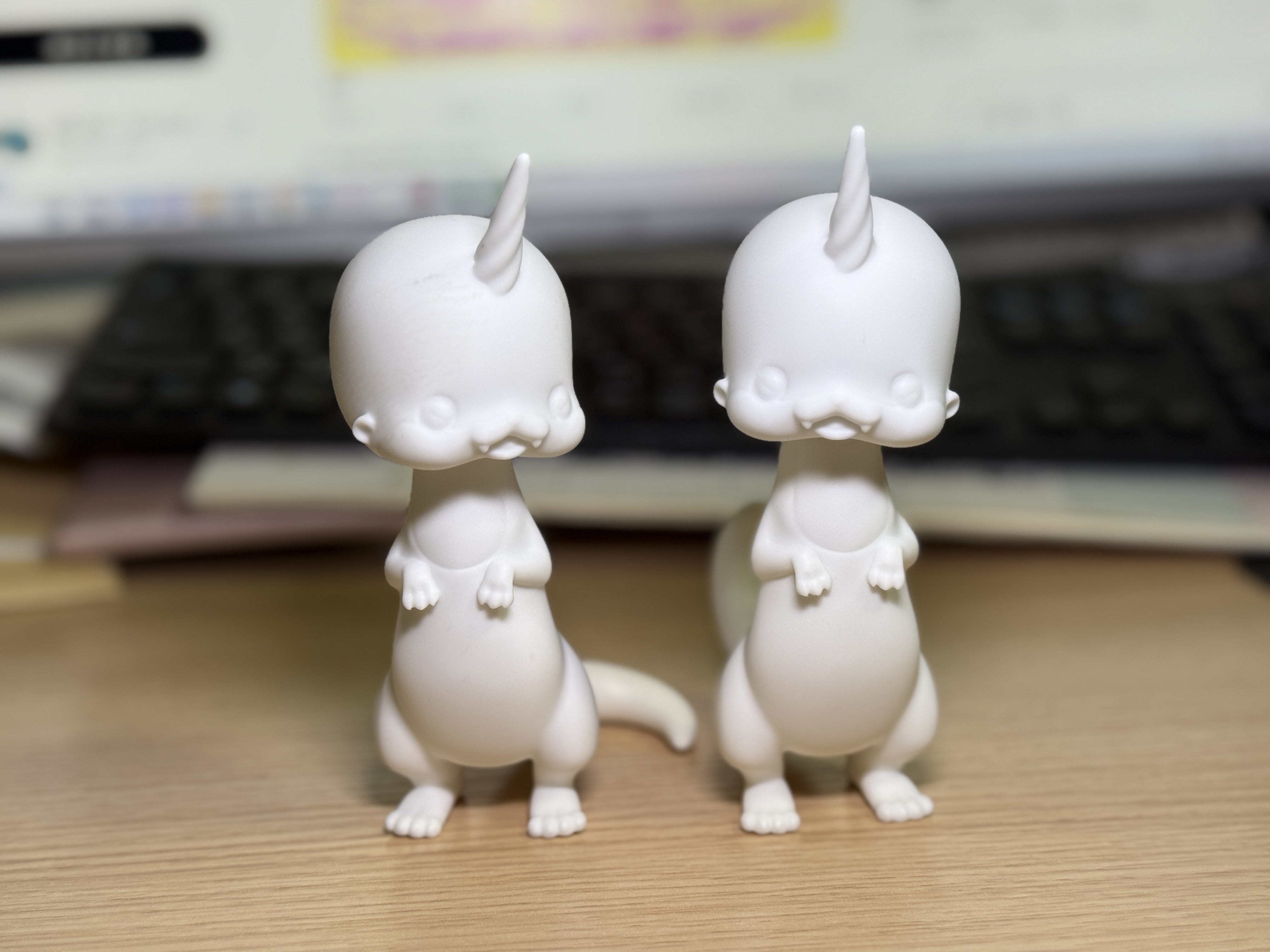 金型第一弾による「イッカクカワウソソフビ」成形見本と「ジャイアントデスイエティ」が仲良くしている様子です■余談