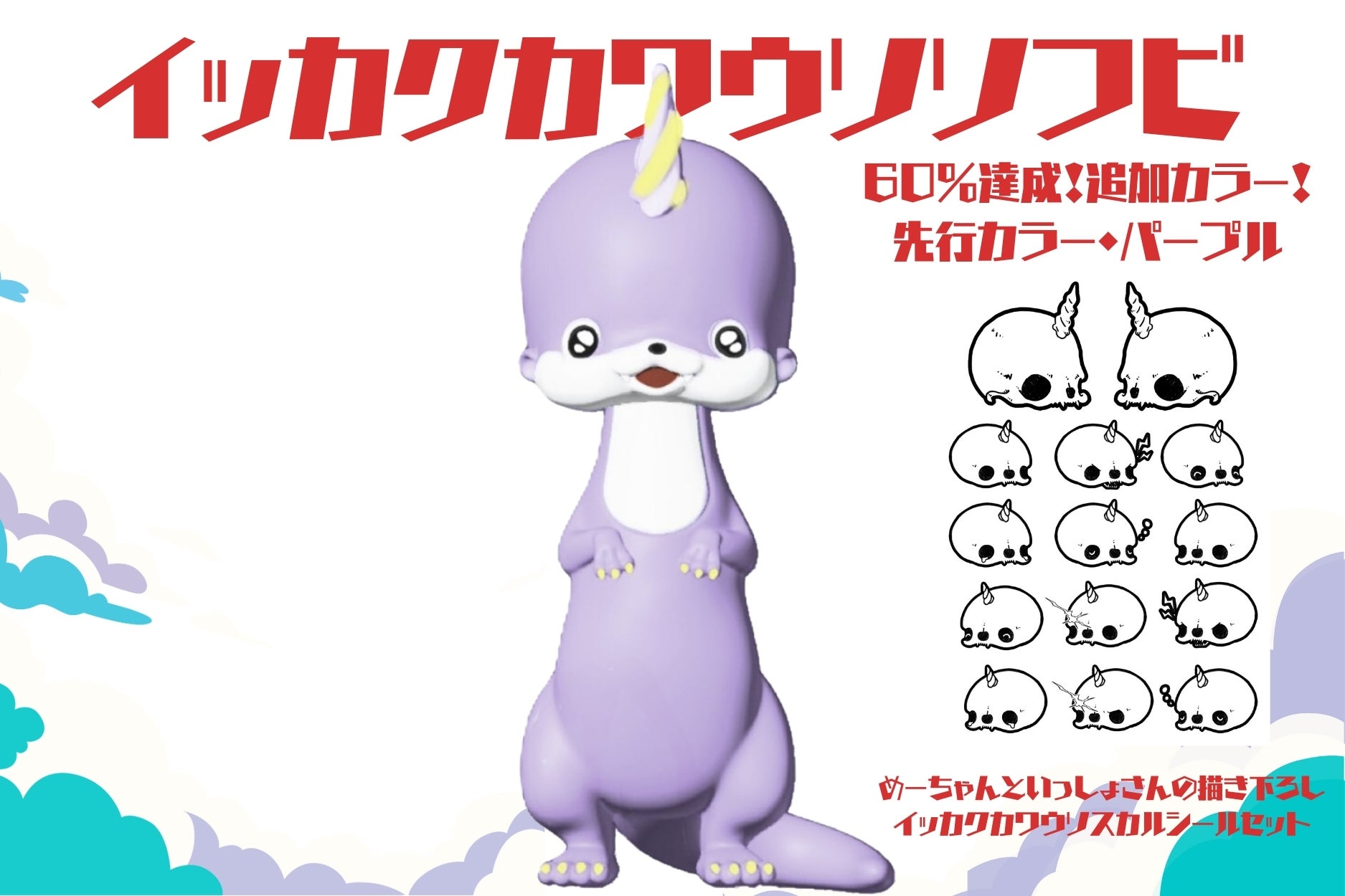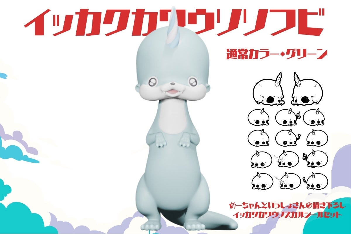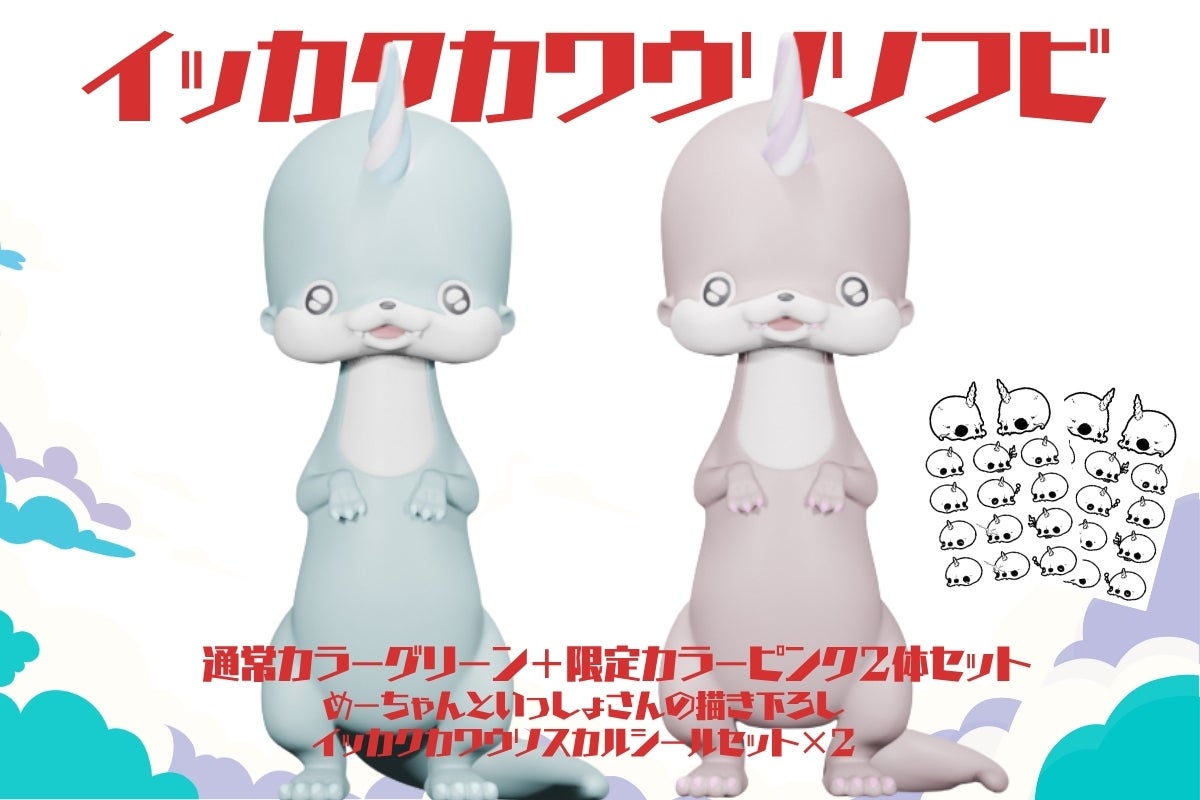 内容:ソフビ2体(通常カラーグリーン+限定カラーピンク)+めーちゃんといっしょさんの描き下ろしイッカクカワウソスカルシール2枚