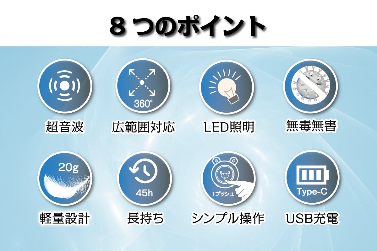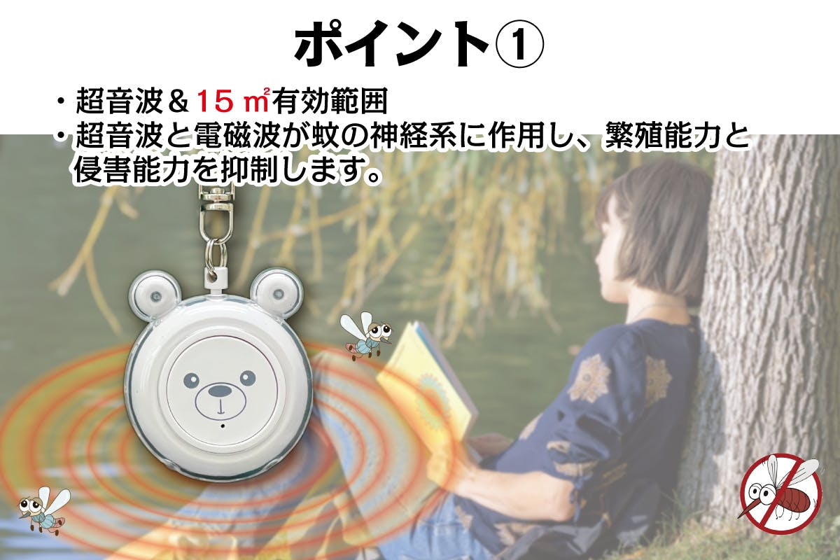 虫の嫌がる超音波の力で嫌な虫を撃退!超音波システムで、化学物質不使用なので臭いの気になる方&敏感肌の方はもちろん、ご年配、お子様、妊婦の方、ペットにも安心してご使用いただけます。