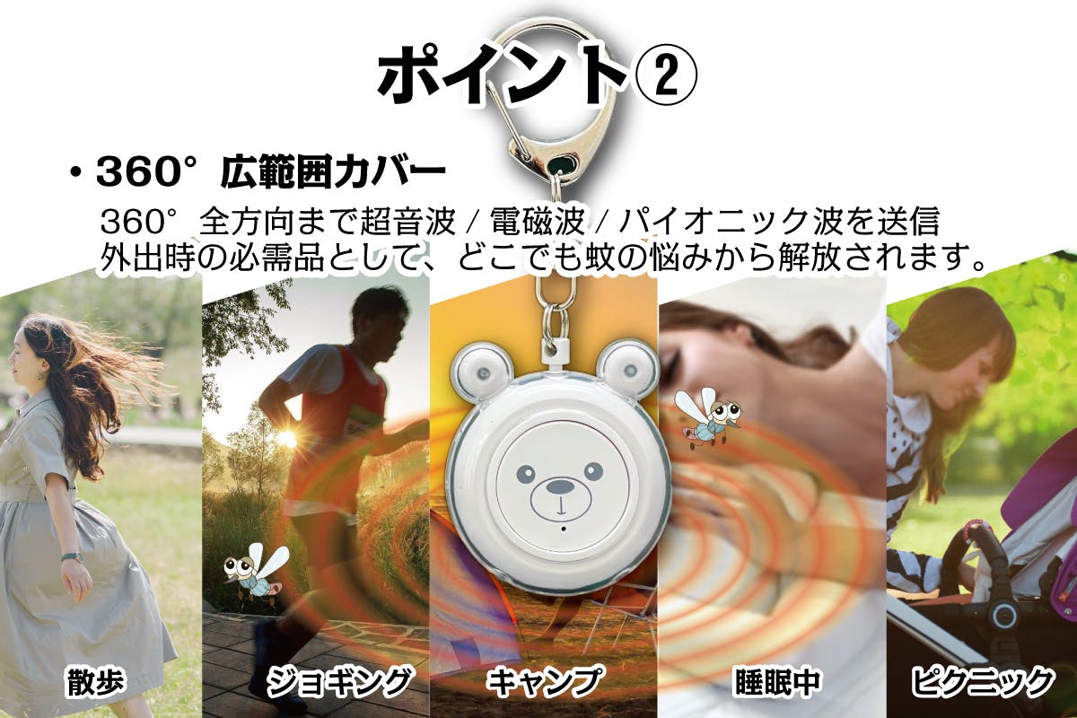 撃退原理は物理的な超音波技術で有効範囲は最大15㎡にもなり、屋外、公園、キャンプ地などでも超音波が十分広がります!スプレーや化学薬品は使用せず、化学的な有害成分は含まれていませんので自然にやさしいアイテムです。アウトドアだけではなく、屋内でも使用できます。山登り、夜釣り、屋外園芸、農業、山林作業などにも最適です。