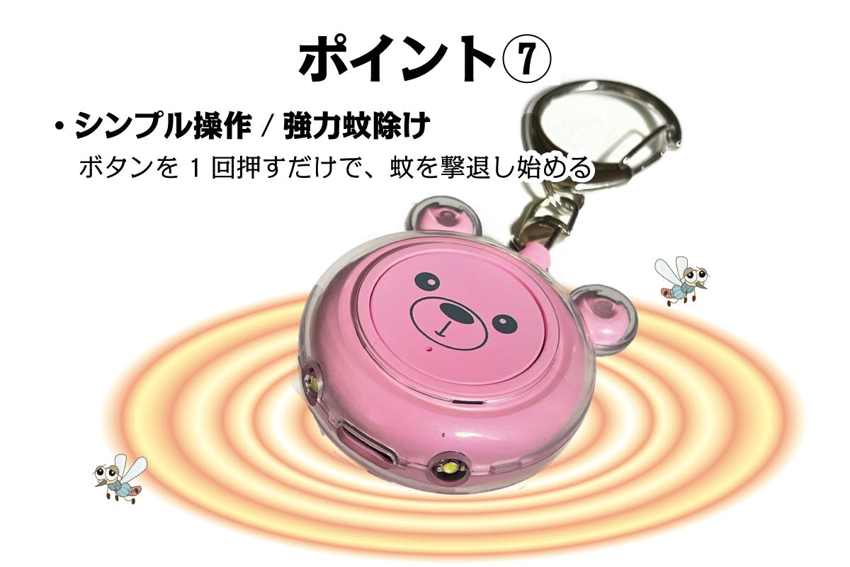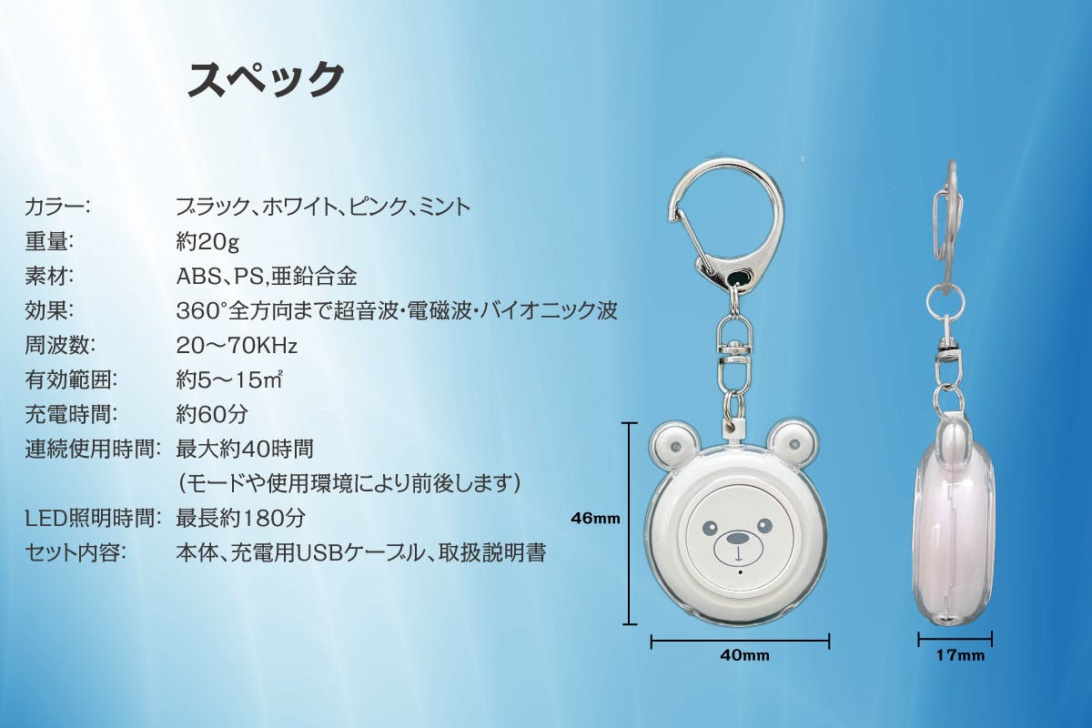 虫が嫌いな超音波を発するキーホルダータイプの虫除け/蚊よけアイテムです。360°に特殊⾳波を送ることで嫌~な虫を撃退!20Hz~70KHzの幅広い音波を発信します。化学薬品は⼀切含んでおりませんので環境にも、赤ちゃんにもペットにも安心の虫よけ。また、軽量コンパクトでどこでも引っ掛けるだけでOK!