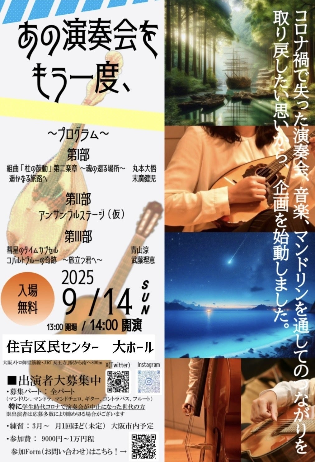 私たちは関西のマンドリンクラブの卒業生を中心に、コロナ禍で演奏の機会を失った人々と共に集まりました。