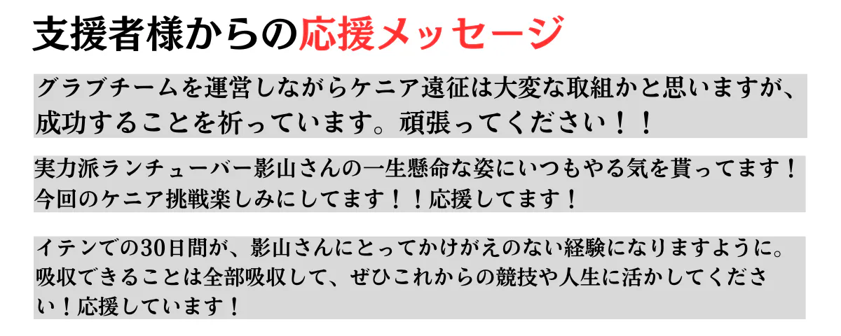 ケニアでの長編ドキュメンタリー制作は、前例が少なく、大きな注目を集める企画になると確信しています。視聴者の皆さまにワクワクをお届けできるよう、映像のクオリティにも徹底的にこだわり、心を込めて制作してまいります。また、帰国後にはトラックレース(5000m/10000m)に出場し、自己ベストを更新することで、この挑戦の成果を言葉だけでなく、結果としてもしっかりと示したいと考えています。最後までお読みいただきありがとうございました。