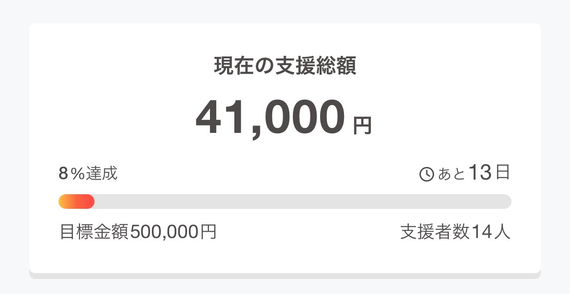 【感謝】あと少しで目標金額の10%です。皆様多大なるご支援ありがとうございます。