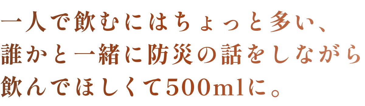 一人で飲むには少し多いけれど、でも、誰かとシェアするにはちょうどいい。3月11日の周辺に、家族や友人とこのビールを分け合いながら、「いざという時どこに逃げる?」「何を持って行く?」といった防災の話をしてもらえたら。そんな想いから、あえてこの容量を選びました。