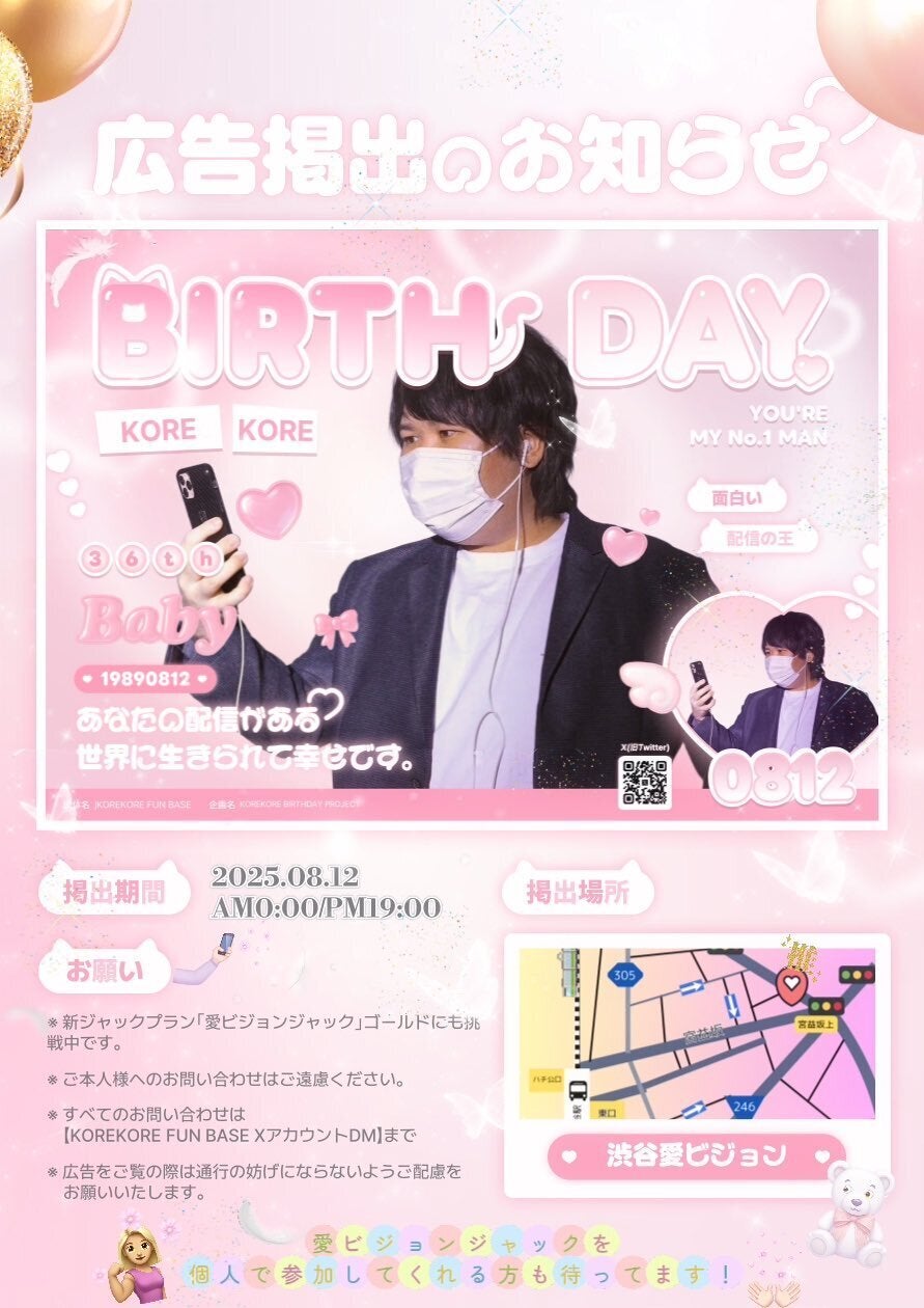 【渋谷愛ビジョンさまで広告決定!】8月12日、時計が0時になったと同時に渋谷愛ビジョンさまにて、コレコレさんへのお誕生日のメッセージ等が流れます。夜19時からも放映です。この様子はYouTubeでも生放送されるので楽しみにしていてくださいね!