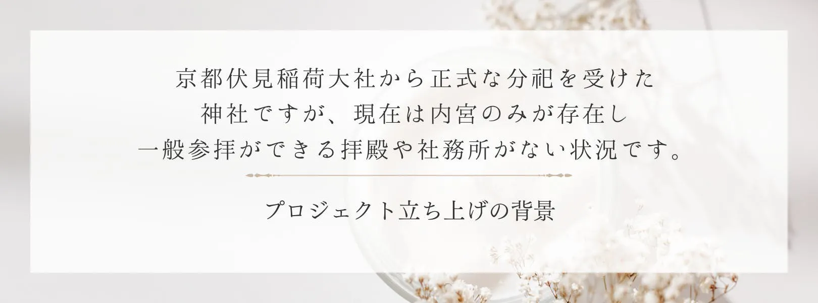 私たちの神社は、京都伏見稲荷大社から正式に分祀を受けた、由緒ある稲荷神社です。現在、「内宮(神の鎮座する場所)」のみが存在し、一般の方が参拝できる拝殿や社務所がない状況です。そのため、直接のご参拝を受け付けることができず、ご神縁を結びたい皆様に十分な環境を提供できておりません。