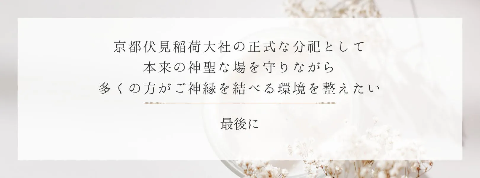 私たちは、京都伏見稲荷大社の正式な分祀として、本来の神聖な場を守りながら、多くの方がご神縁を結べる環境を整えたいと願っています。