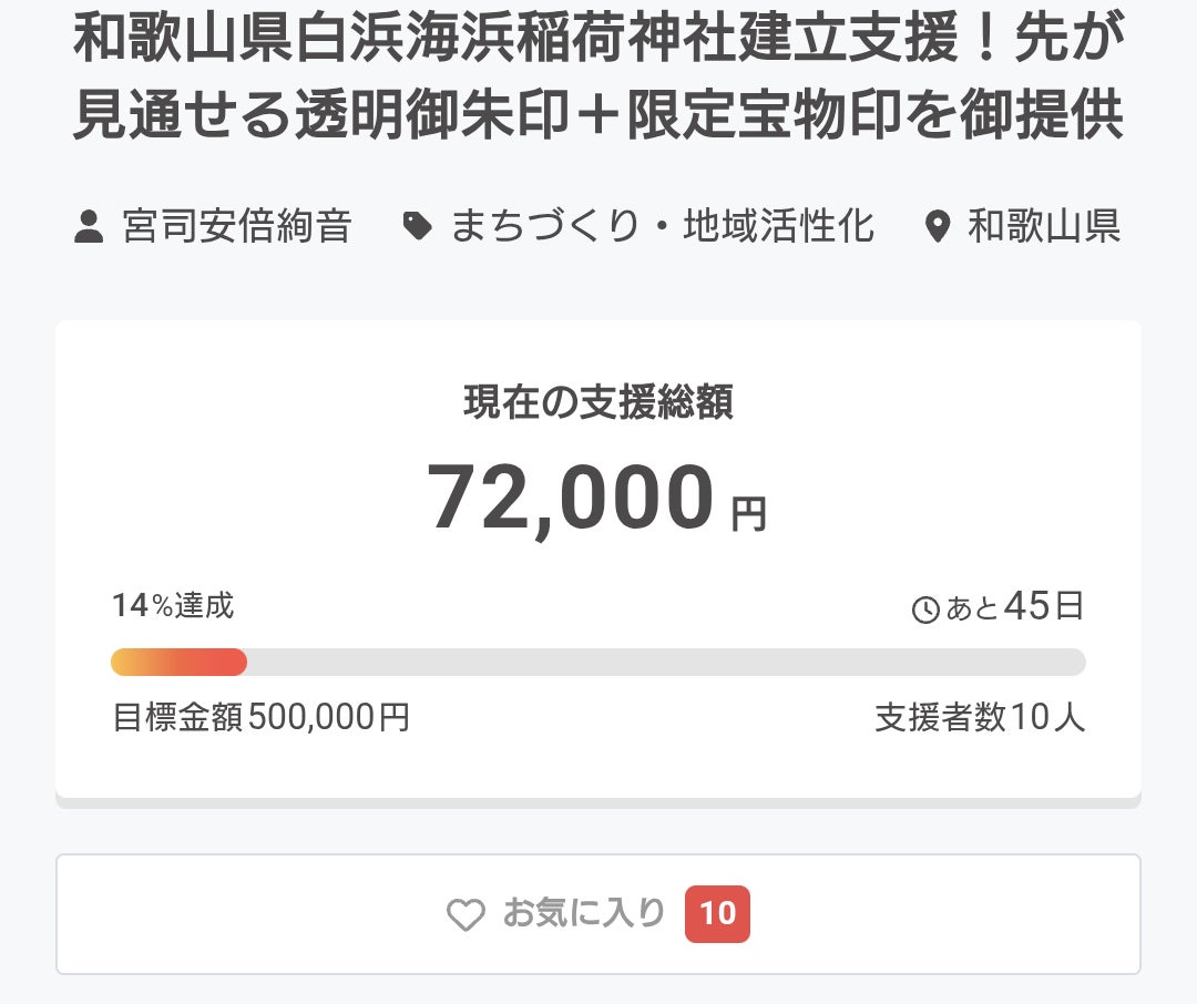 現在の支援総額は【72,000円】、支援者数【10名】。目標金額50万円に対し、14%の達成率を賜っております。