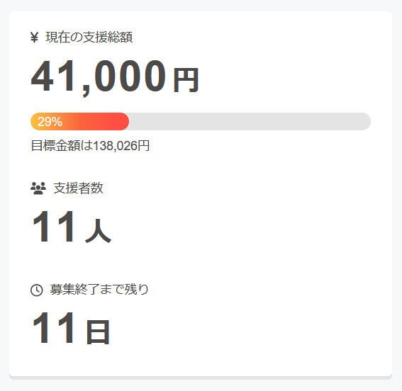 現在の調達率は29%、パトロン様は11名となっております。