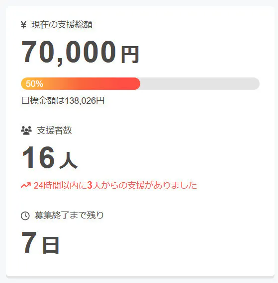 現在の調達率は50%、パトロン様は16名となっております。