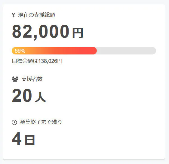 現在の調達率は59%、パトロン様は20名となっております。