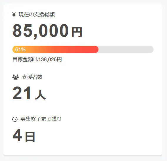 現在の調達率は61%、パトロン様は21名となっております。