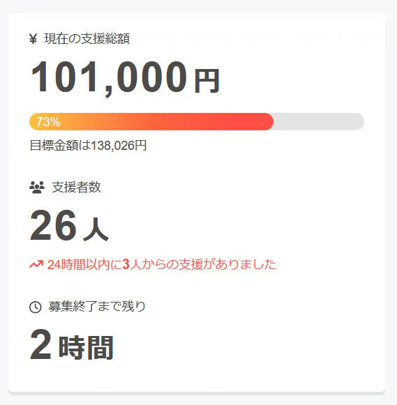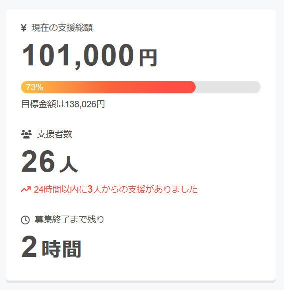 現在の調達率は73%、パトロン様は26名となっております。