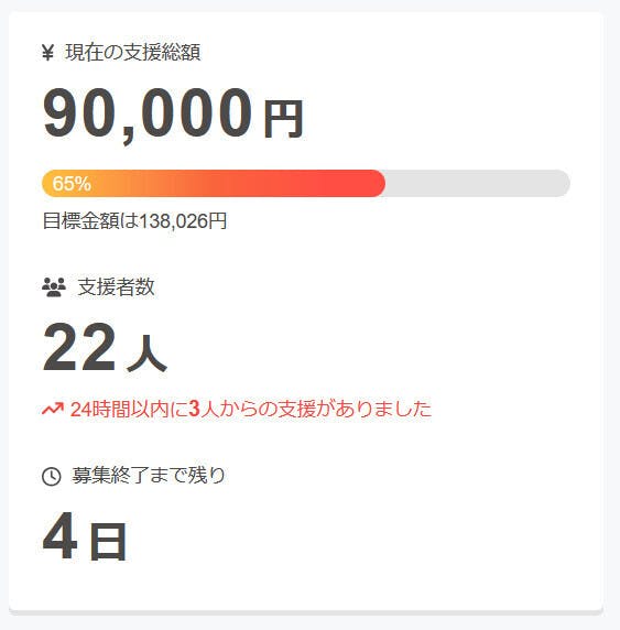 お世話になっております。 名無しの東北県人です。 前回の活動報告から現在までの間に、 新たに1名の方がご支援を行って下さいました。 現在の調達率は59%、パトロン様は20名となっております。 本当にありがとうございます。 引き続き、何卒宜しくお願い致します。