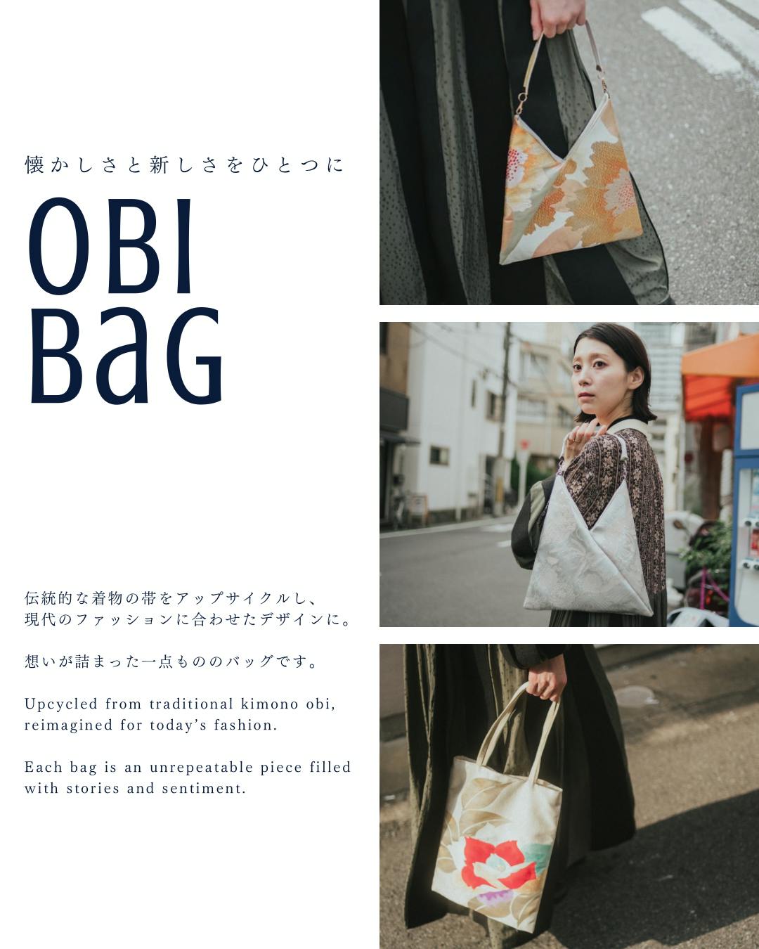 着物の帯という昔の素材を活かしつつ、現代のファッションに自然に溶け込む、新しいスタイルのバッグです。