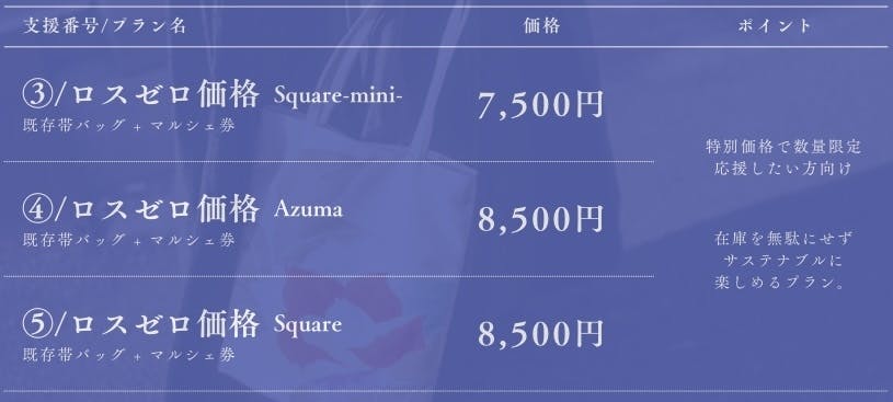 既存バッグを通常価格(Square-mini:¥9,900 Azuma / Square:¥11,000)よりお安く入手できます。