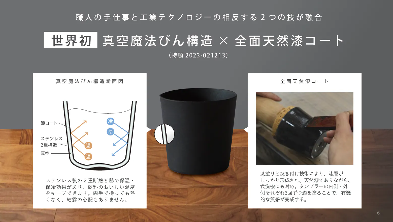 一見、スタイリッシュ。ですが中身は、魔法びん構造でしっかり温度をキープ。なめらかな口あたりと、漆ならではの有機的な質感。金属臭もないので、デリケートな飲み物の風味も損ないません。