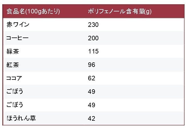 以下の表のように食品100gあたりのポリフェノール含有量を比較してみると、赤ワインは230mg。