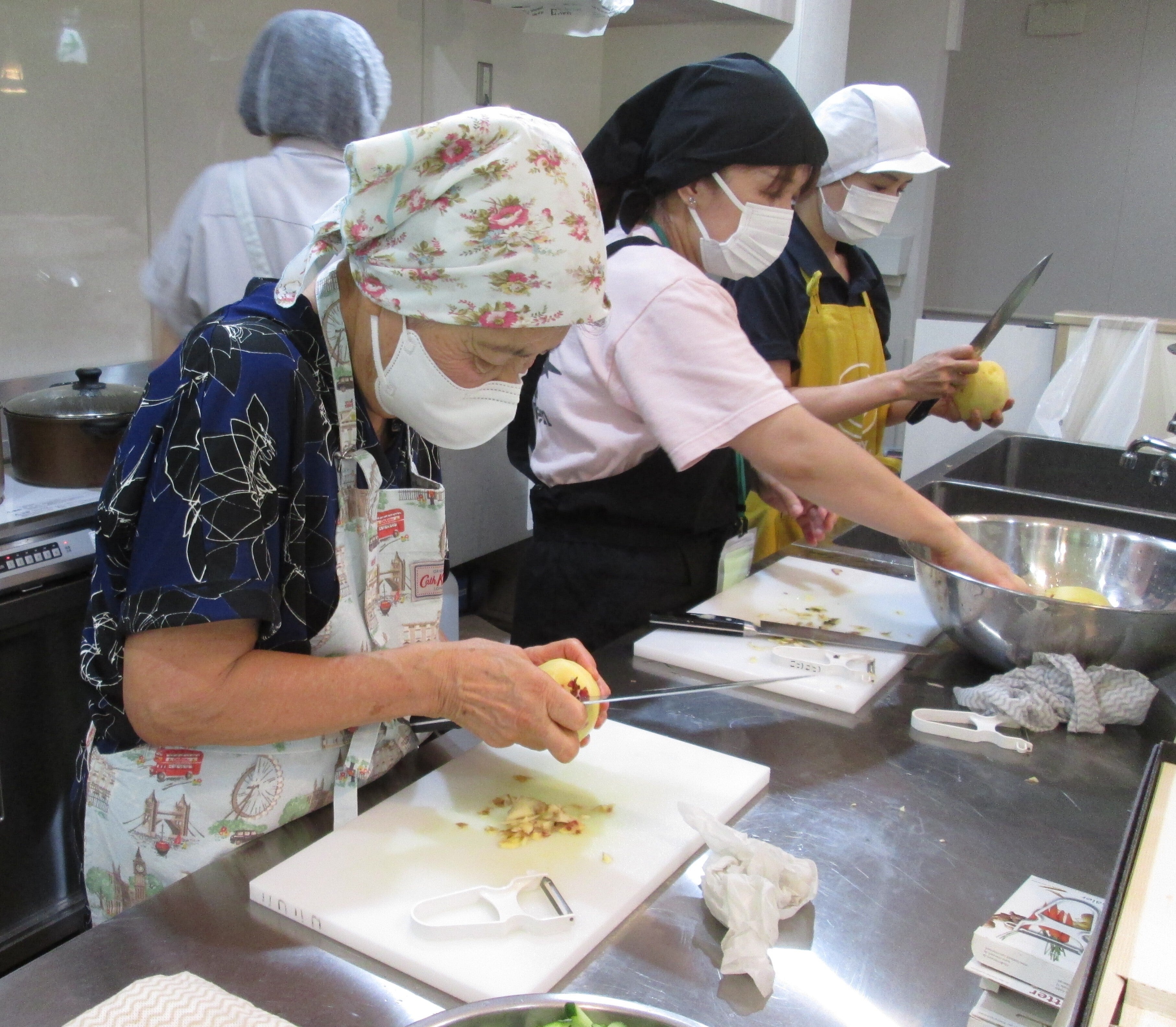午後には、午前とは別のボランティアの方が来てくださり、調理と盛り付けを始めます。