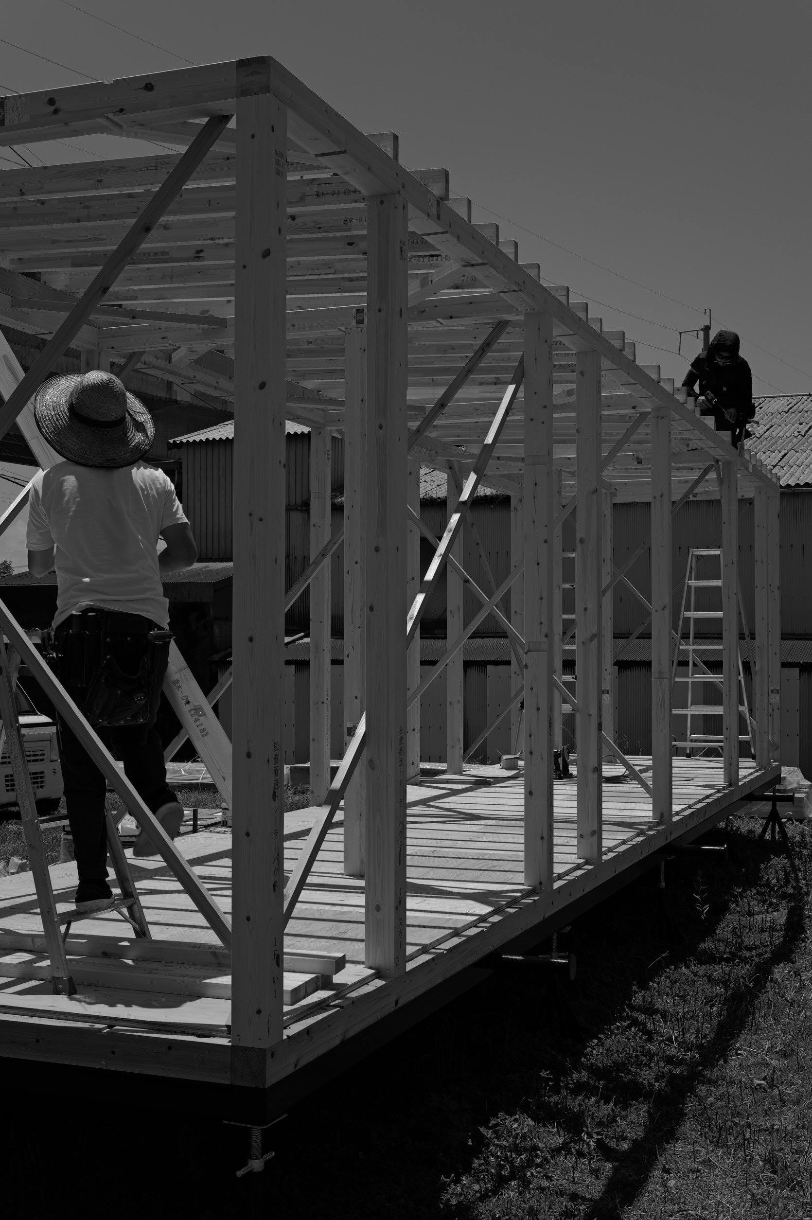 地面は整地も沢山必要とせず、上下水道と電気工事を行い、砕石の上にシャーシを載せます。