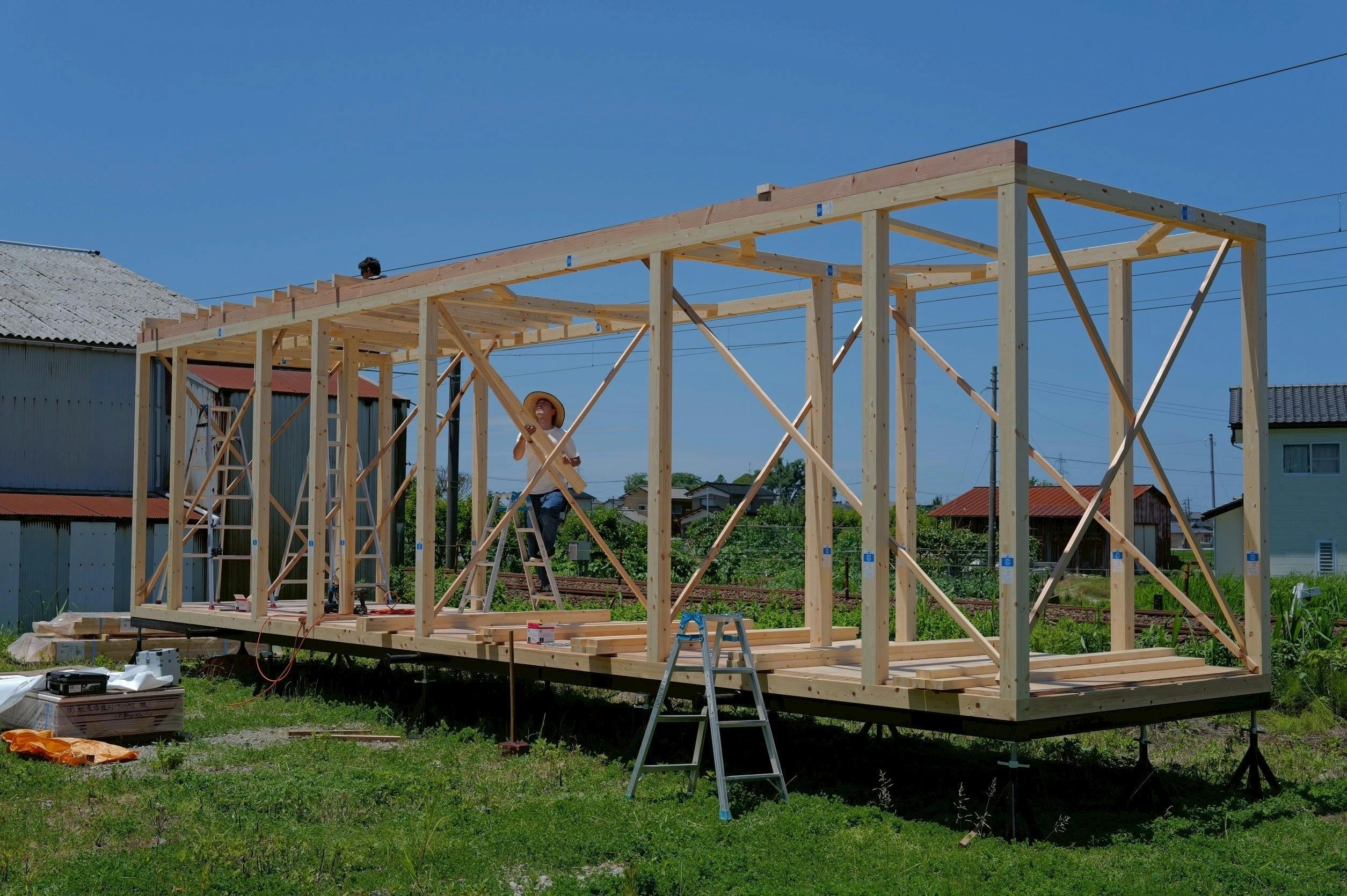 こんにちは。金七です、今日は5時起き6時に金沢を出発しました。道中かなり雨がひどくて怖いなぁとも思いました。お酒の配達に、柳田と宇出津と小木を通って松波へ。地元民しか通らないような道を走り、途中通行止めや倒木があって、Uターンもできず、バックしながら坂道を走るなど。木を切りに来た方に助けてもらって事なきを得ました。雨もひどくて、愛知県からトレーラーシャーシの到着は11:50くらいでした。待ってる間に、SNSを更新なども!CAMPFIREのクラファンも今朝、目標の3分の2までご支援をいただいてます。本当にありがとうございます。ついにその時は来ました。スコールのような雨が上がって、すごくいいお天気になり、設置作業時はとても順調に進みました。設置作業時はとても順調に進みました。3時出発でいらっしゃったとのこと。ありがとうございます。黒いシャーシはまるでキリコの片棒のよう。設置の待ち時間は林のようになった雑草見て試し抜いたらとても抜けた。2人でかなりきれいにしました。1人1草抜き運動、いや1坪運動広げたいです。完成!