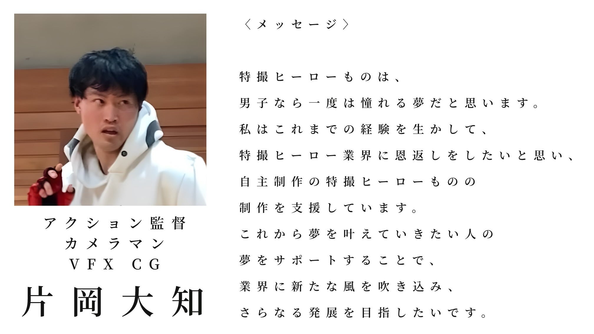 造形師(アクションコスチューム、小道具、3Dモデリング)、アクション(ザナプロジェクト総監督、出演、スーツアクター)の分野にて活動中。