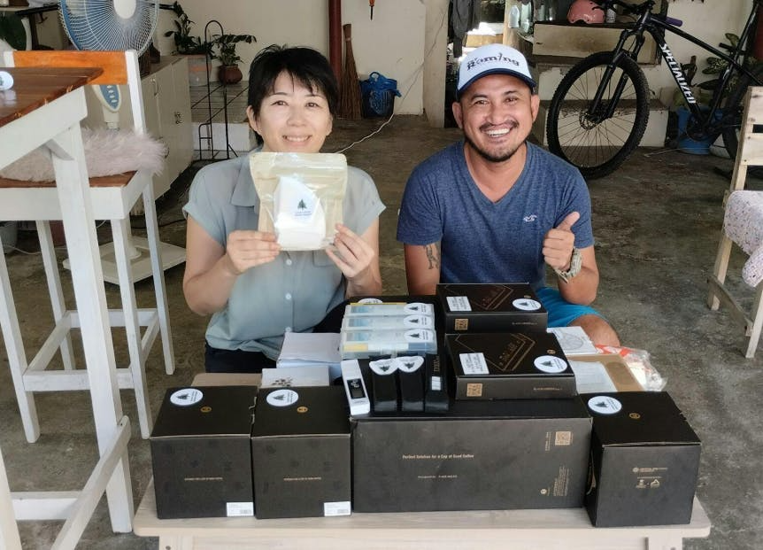 7月|クラファンの資金で購入したのはまずこれらのアイテム。Arielさんの指示でコーヒー収穫後の糖分測定器や、コーヒーのハンドドリップ器具を調達しました!農家さんたちも実際に美味しいコーヒーの淹れ方を練習しています。