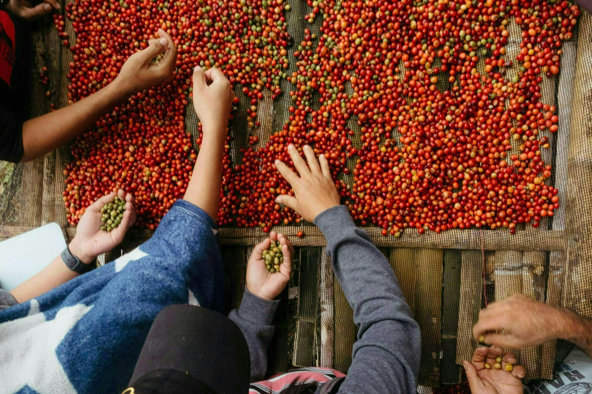 原生林のシダや倒木をかき分けて、肥沃な大地で完熟したコーヒーチェリーを一粒ずつ手摘みします。
