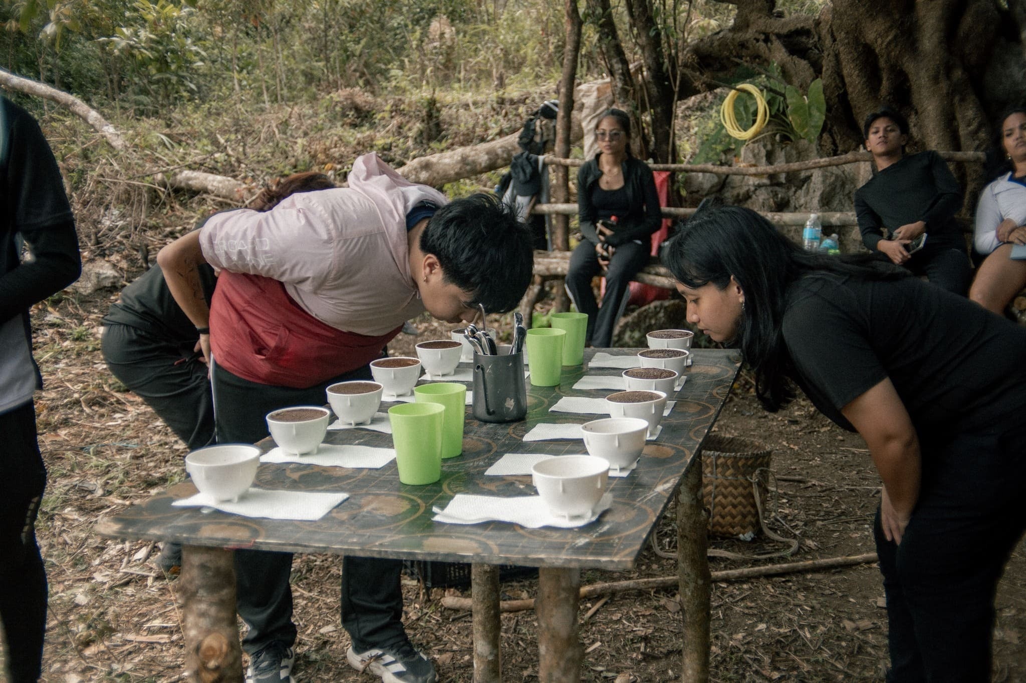 こんな森の中でも技術を磨きます。挽いた粉にお湯を注ぎ、専用スプーンですすってコーヒーの香りや味を比較し、評価する国際的なテイスティング手法です。
