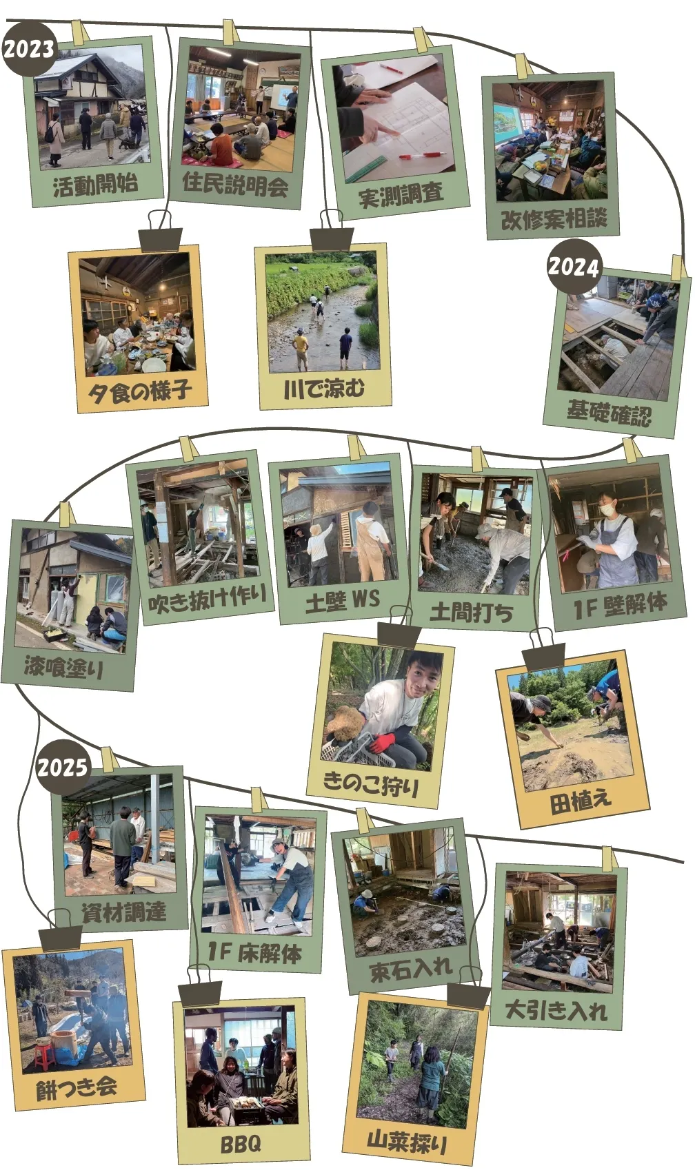 域内外の人々の力をお借りしながら、学生が中心となって、地元素材を活かした改修を今後も引き続き行い、2027年の竣工を目指します。