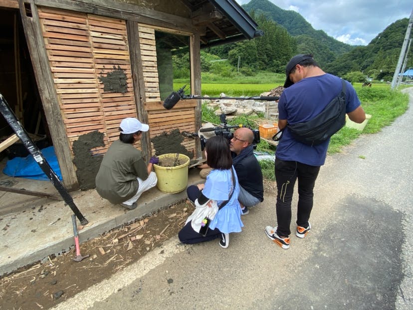習得した技術で土壁を縫っていきます。土壁は3層ぐらい塗り重ねて強度と見た目を仕上げていきます。一番下の層を塗りました。下地の隙間に土を塗り込まないと、土が落ちてきてしまいます。水の量など調整しながら塗り進めます。以前、信級が新聞に取り上げられたことをきっかけにTVと新聞の取材を受けました!受け答えもバッチリですね!