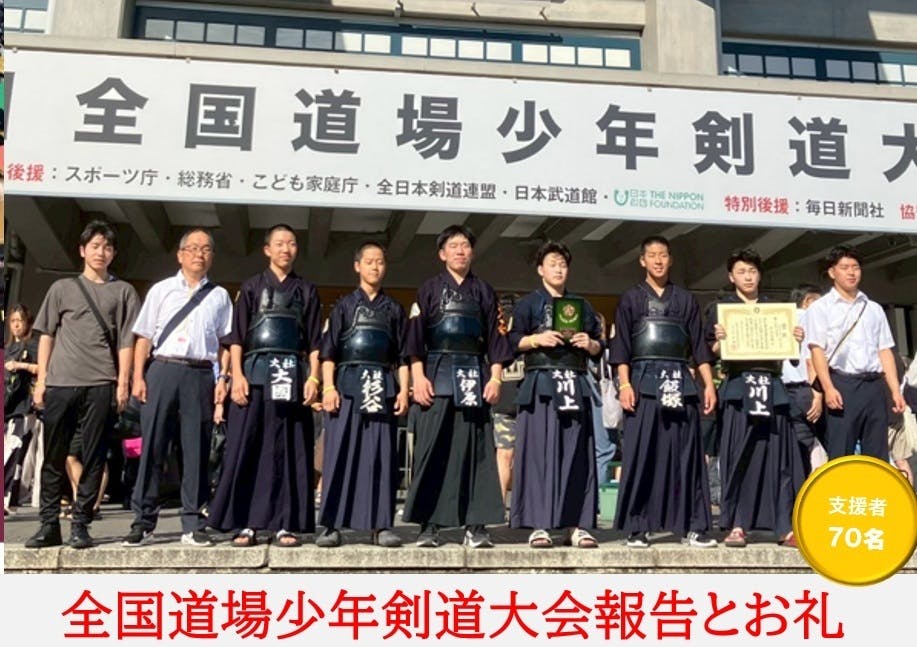 2025/08/05 08:29この度は、大社道場のクラウドファンディングに温かいご支援を賜り、誠にありがとうございました。おかげさまで、目標金額である30万円を無事達成することができました。不安も抱えながらのスタートでしたが、皆様からの力強いご支援と応援のおかげで、プロジェクトを大成功のうちに終えることができました。総勢70名の皆様(うち30名はCAMPFIRE外でのご寄付)からいただいたご厚意に、関係者一同、心より感謝申し上げます。また、温かい応援メッセージや励ましのお言葉も、子どもたちや私たちスタッフにとって大きな励みとなりました。全国大会では、選手たちは堂々と戦い、コート3位という素晴らしい結果を残すことができました。大舞台での経験は、子どもたちにとってかけがえのない財産となりました。今後も一層精進を重ね、稽古に励んでまいります。皆様のご健康とご多幸、そしてますますのご活躍をお祈り申し上げ、感謝のご挨拶とさせていただきます。 もっと見る壮行会開催しました