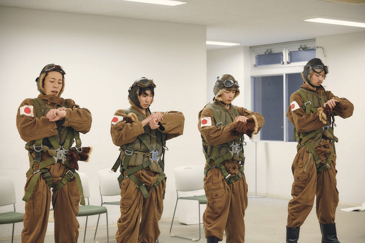 舞台に⽴つのは、特攻隊員と同じ年頃の、現役⽣をはじめとした者たち。