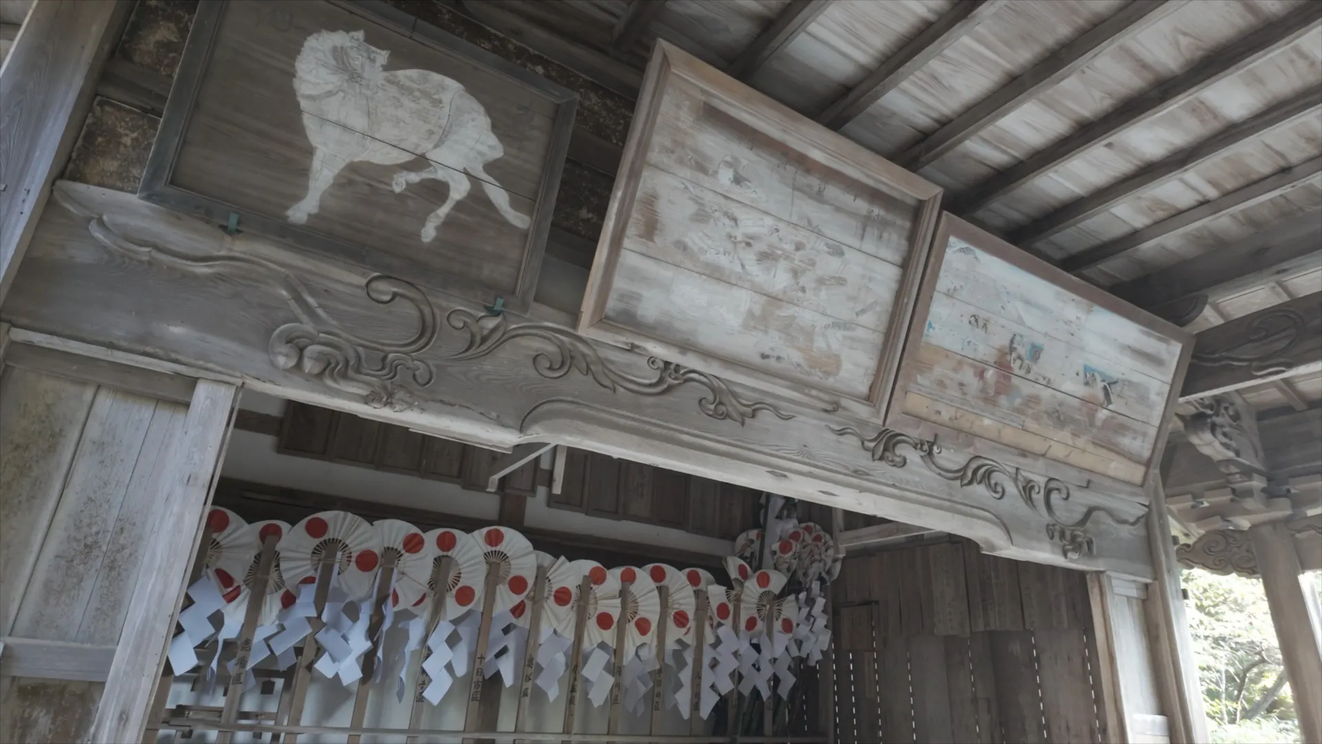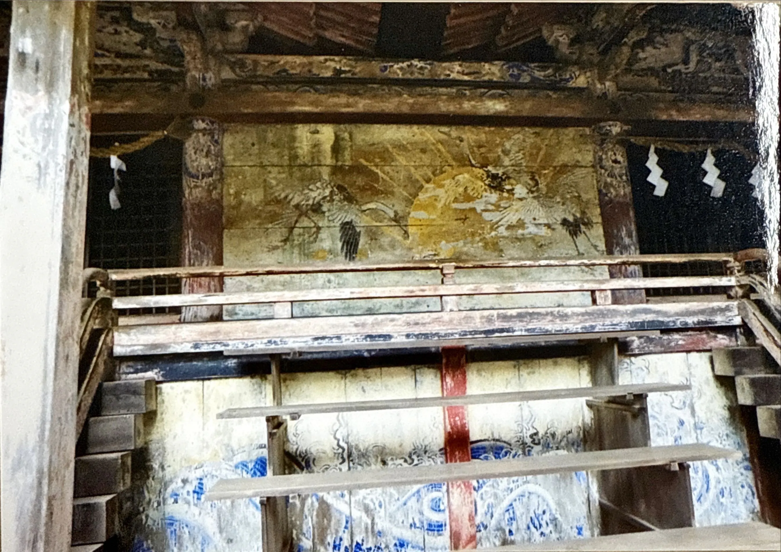 また、 本殿2棟をつなぐ障壁の正面には、伝説と相まった歴史ある日食を表す絵が描かれているのですが、その絵もだんだんと薄くなり、何が描かれているのかもわかりづらくなっています。
