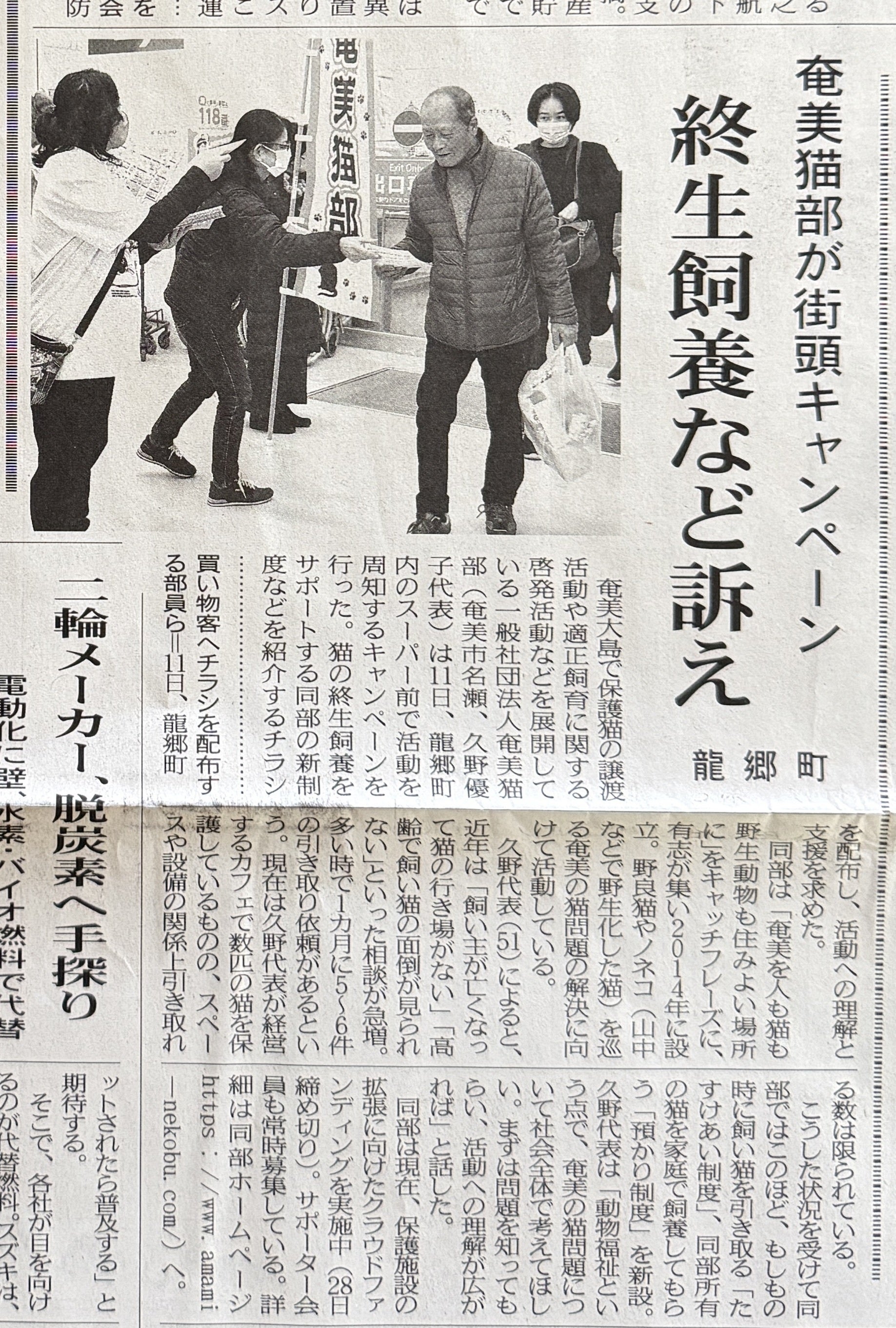 いつも応援、本当にありがとうございます。先日の2月11日(水/祝)、龍郷町「ビックⅡ」様のご協力のもと、店舗入り口付近にて啓発チラシ配布イベントを実施しました。今回この啓発を行った背景には 、先日から相談対応についての大変さもお伝えしておりますが、ここ最近、飼育困難による "飼い猫の引取り相談" が急増しています。主に飼い主さんの高齢による飼育困難が原因で「施設に入ることになった」「身内が亡くなった猫を引き取って欲しい」など、以前は数ヶ月に1件くらいだったのが、ここ1ヶ月ほどで5〜6件の相談がありました。奄美大島には愛護センターがないこともあり、こうした相談が奄美猫部に集中しやすい状況です。行政も把握できていない問題でもあるので、現状を知ってもらうためにも急遽開催いたしました。※全て奄美猫部以外からのお迎え猫さんです(拾ったか、他からの譲渡猫)ただ現実問題として、無償ではお引き受けできないケースがほとんどです。こういう状況から、数年前から奄美猫部では「たすけあい制度」というものを整えています。ですが、費用をご用意できない事例がほとんどで、これまでかなりの数の相談がありましたが、その後どうなったか分からないままのケースも多くあります。そうした猫たちは遺棄されてしまっている可能性も大きく、そうなると再び野生動物への脅威に逆戻りになりかねません。積み重ねてきた猫対策に逆行してしまうことを、とても危惧しています。さらにこの度、これから飼う方向けの新制度「預かり制度」もスタートいたしました。今回、両制度の紹介も行いましたが、制度自体が地域に浸透して機能するまでには時間が必要です。このような相談に対応していくためにも、隔離施設などの基盤作りが必須で、なんとか自分たちで体制作りに奔走しております。なかなか厳しい状況ですが、模索は続けております。同時に、行政に向けて、体制づくりのための働きがけも継続して行っております。少しずつでも広がってほしいと願っていますが、すぐにはどうすることもできない歯痒さが募ります。でも、相談が増えている今こそ、地域全体で考えるタイミングだと思っています。今回の啓発が、その一歩になれば嬉しいです。たすけあい制度の詳細はこちらから↓https://www.amami-nekobu.com/support引き続き、奄美猫部への応援よろしくお願いいたします。写真は、2月12日付けの地元紙「南海日日新聞」の記事