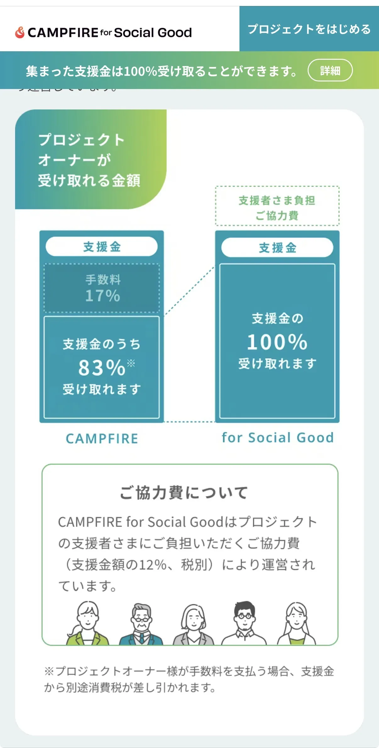 今回のクラウドファンディングですが、CAMPFIRE「for Social Good」を通じて実施することになりました。その仕組み上、ご支援の際には、支援金額とは別に所定の決済手数料等を、支援者様にご負担いただく形となっております。