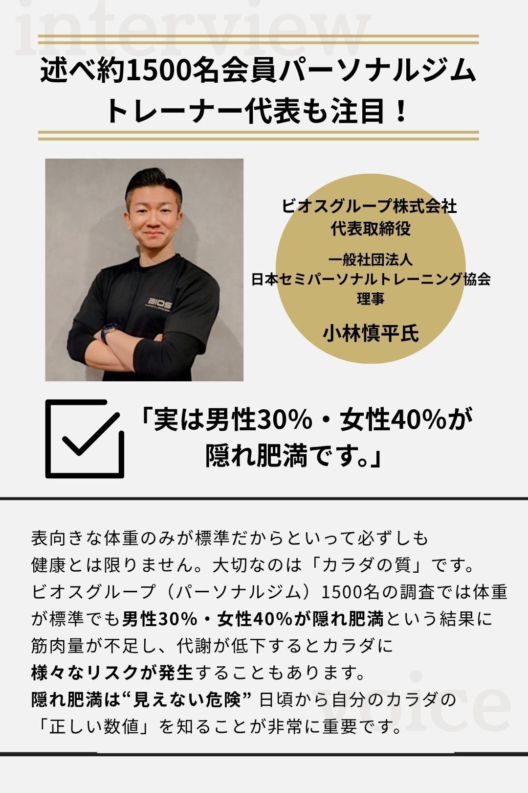 皆さん、こんにちは。プロジェクトチームの田宮です。お陰様で本プロジェクトは初動たくさんの応援者さまのご支援をいただくことになりました。本当にありがとうございます。本日は“からだの質”の大切さを改めてお伝えするため、 延べ1,500名の会員を指導するパーソナルジム代表・小林慎平トレーナー からいただいたメッセージをシェアします。ーーーーーーーー「実は男性30%・女性40%が隠れ肥満です。」表向きな体重のみが標準だからといって必ずしも健康とは限りません。大切なのは「カラダの質」です。ビオスグループ(パーソナルジム)1500名の調査では体重が標準でも男性30%・女性40%が隠れ肥満という結果に筋肉量が不足し、代謝が低下するとカラダに様々なリスクが発生することもあります。隠れ肥満は“見えない危険” 日頃から自分のカラダの「正しい数値」を知ることが非常に重要です。ーーーーーーーーいかがでしたでしょうか?だからこそ、56項目を一度に測定できる体組成計をおすすめします。ご自身の “見えない数値” を把握し、数字に基づいたボディメイクを始めましょう。ぜひ少しでも気になりましたら、ご支援をよろしくお願いいたします!ここまでご覧いただきまして誠にありがとうございました!