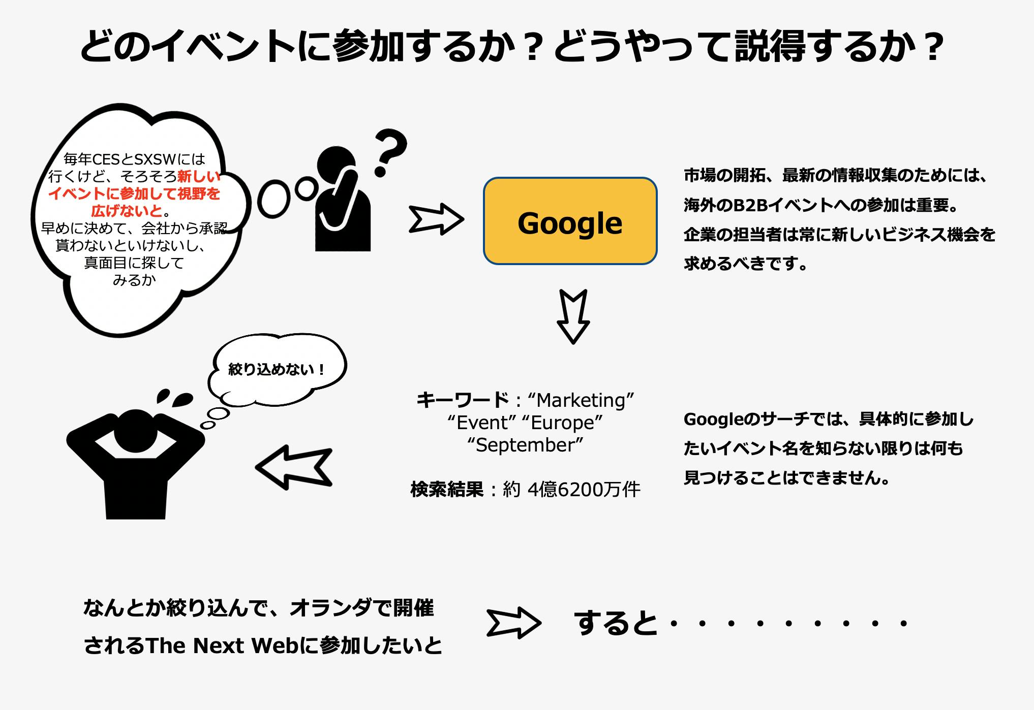 Googleで海外イベントを探すのは大変です。(英語があまり得意でない)日本人が適切なイベントを知ることができる唯一の方法は、知り合いからの口コミだったりするのが現状です。