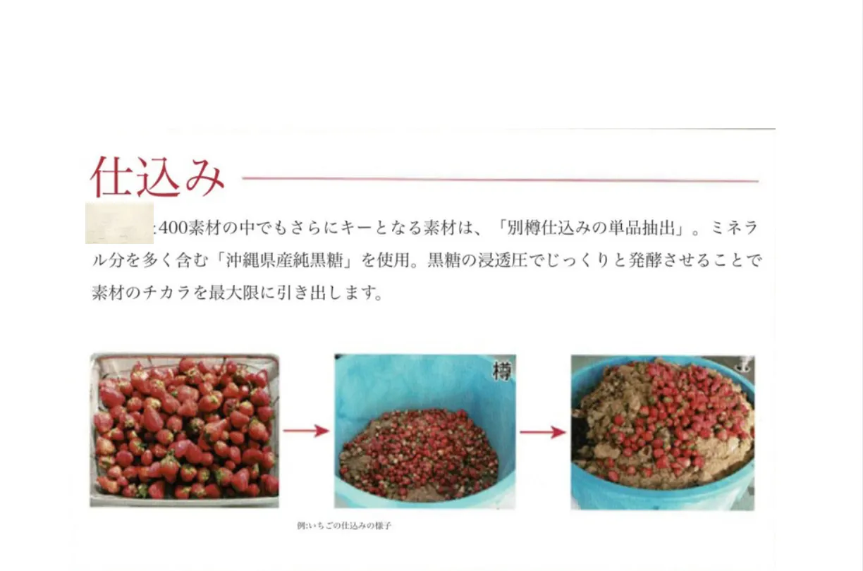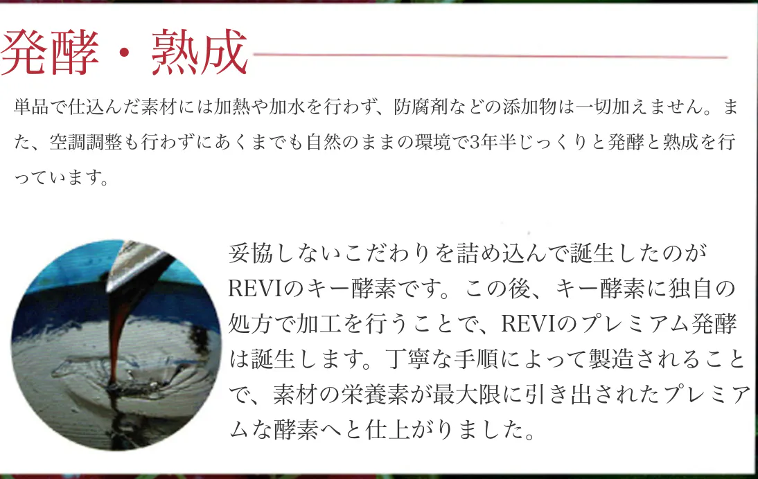 栄養素を最大限に引き出すために、400素材の中でもさらにキーとなる素材は、四季折々の「旬」のものを使用し別樽仕込みの単品抽出。 そしてミネラル分を多く含む「沖縄県産純黒糖」を使用し、浸透圧でじっくり発酵させることで素材のチカラを最大限に引き出しました。 単品で仕込んだ素材には一切、加熱や加水、防腐剤などの添加物は加えず、空調調整を行わずにあくまでも自然のままの環境で3年半じっくりと発酵・熟成を行い、妥協しないこだわりを詰め込みです。とうもろこし由来の難消化デキストリン、3種のオリゴ糖、HMBカルシウム、リンゴ酢を配合し、さらに味ごとに特徴となる成分をプラスしました。ファスティングにはもちろん、日々の美容のプラス栄養素として、デザートのアレンジ素材としてなど、幅広くご愛飲いただけるエンザイムドリンクです。