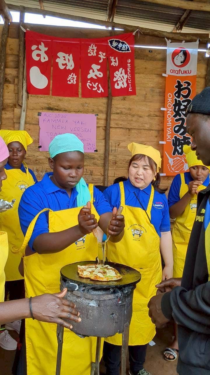 コテ(ヘラ)の持ち方、使い方も伝授。鉄板とコテの「カンカン!」という音を聞いてると日本のお好み焼き屋を思い出しますね〜。