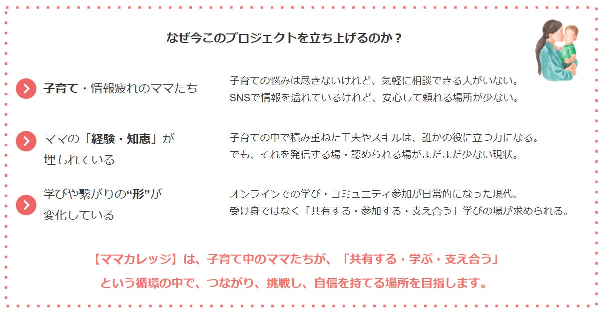 子育て中のママたちが、自身の経験やスキルを活かし、学び合い、支え合う場所「ママカレッジ」。このプロジェクトは、ママたちの「誰かの役に立ちたい」という想いから生まれました。皆さまの温かいご支援が、ママたちの新たな一歩を後押しします。一人でも多くのママたちが、自身の経験を活かし、社会とつながることができるよう、どうか応援をよろしくお願いいたします。