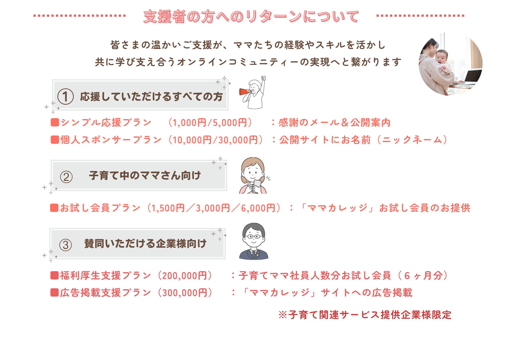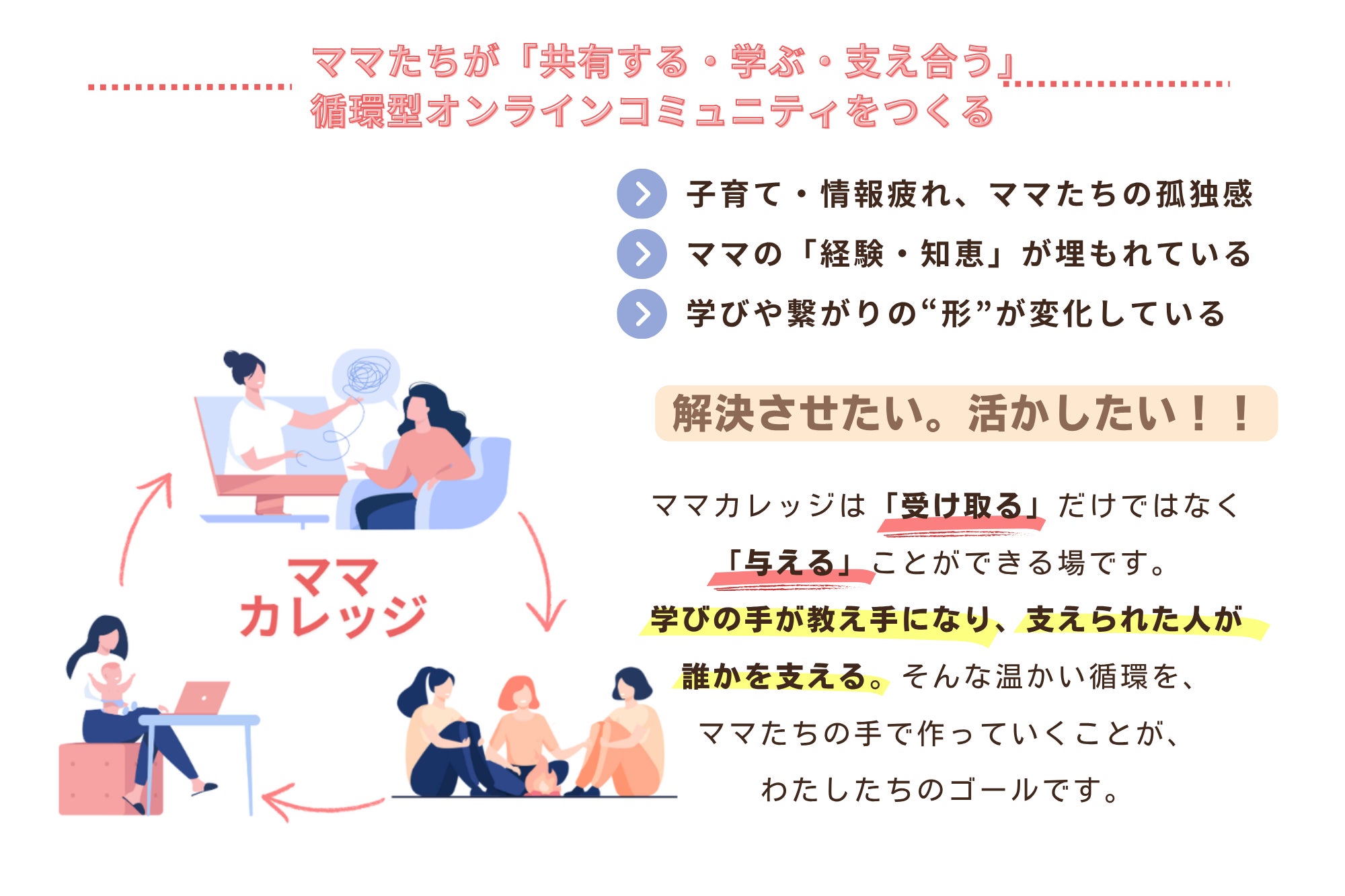 子育てをしながら、自分の時間やキャリアを持つことの難しさを感じたことはありませんか?私たちは、そんなママたちが互いに学び合い、支え合える場所「ママカレッジ」を作りました。一人ひとりの経験が誰かの力になる、そんな温かいコミュニティを一緒に育てていきませんか?皆さまのご支援をお待ちしております。