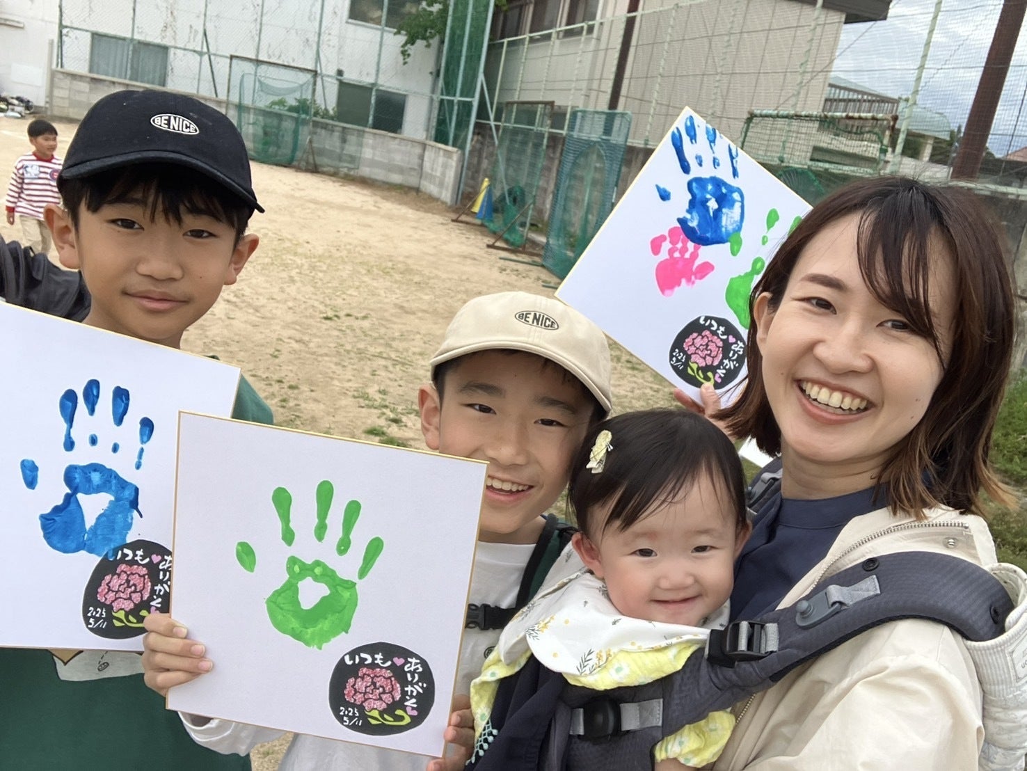 Hachiオリジナル切り絵のプリントが入った色紙に、みんなで手形!