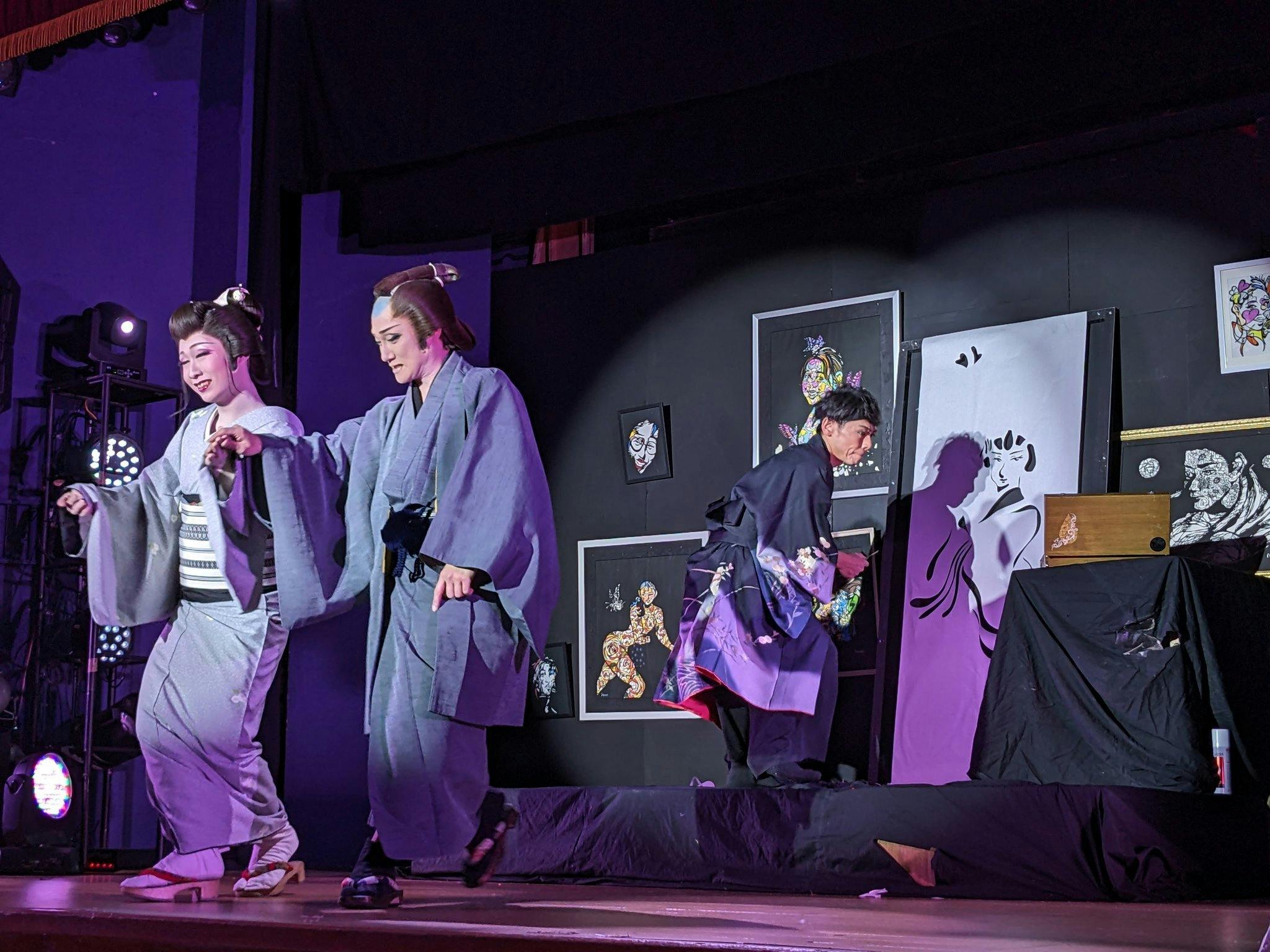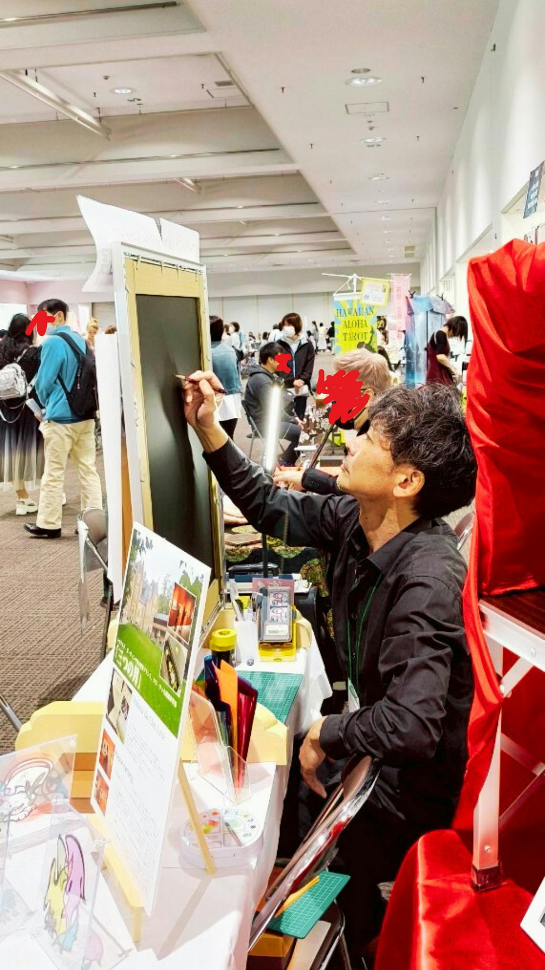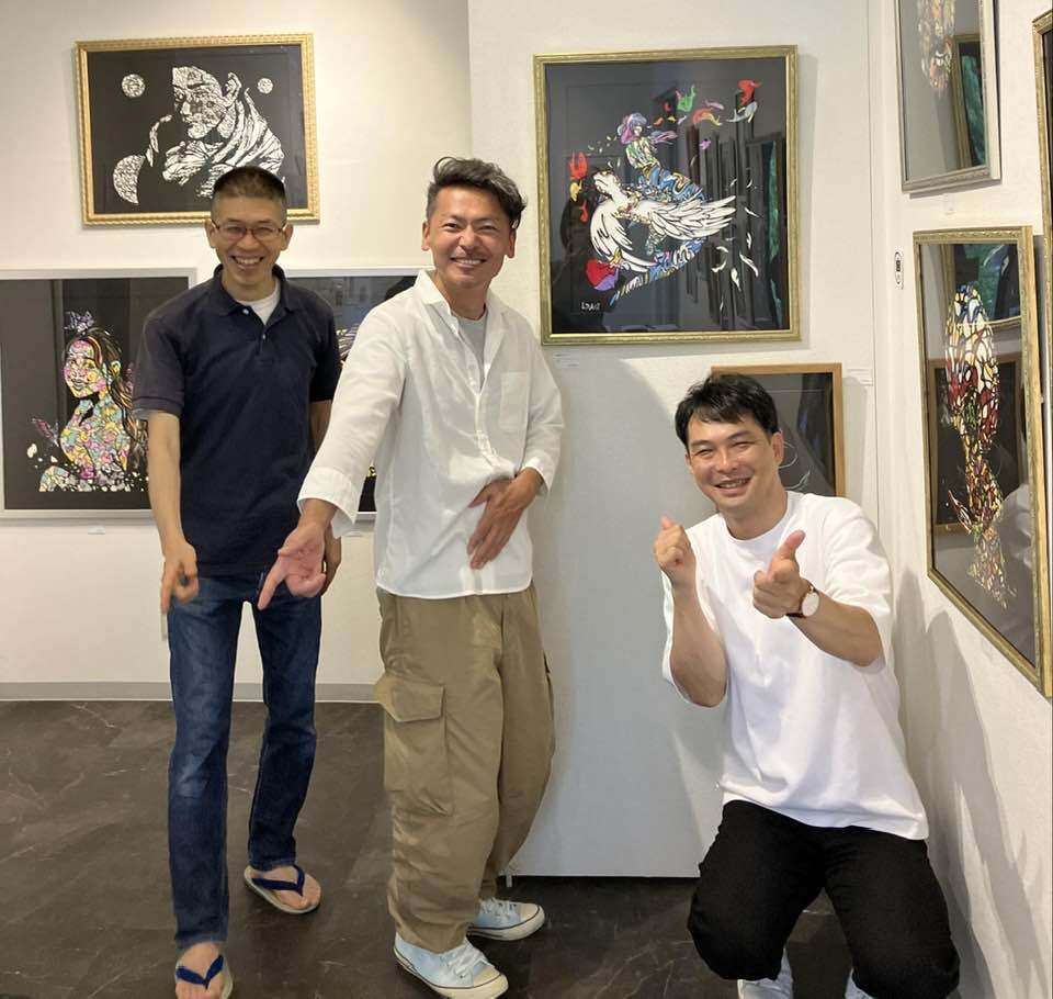 2025/09/23 07:39ハリウッドでの出展会場に参戦したわれわれアーティストメンバーは、Hachiをふくめ6名。それぞれに、現地在住の日本人通訳さんがついてくださいました。皆さん個性豊かなプロフェッショナルなガイド。(彼らをオファーするためにも出展料がかかったわけです)Hachiについてくださったのはネネさん。英語が堪能であることはもちろん、ご自身もアートを制作するのもあり、Hachiの意図することも瞬時に把握し、臨機応変に動いてくださりました。値下げに関する交渉のエピソード(LA日誌②参照)も、彼女なしでは乗り越えられなかったでしょう。Hachiの持参した「漢字一字の切り絵」も、来場者に丁寧にその意味を説明してくれました。そしてHachiの立役者がもうひとり。写真右の男、MASA。アメリカ在住、Hachiの同級生です!といっても、小学校のころ、3年生だか4年生の一寝年だけのクラスメイト。彼の転校後、30年近く交流はありませんでした。5年くらい前、姫路でのライブ切り絵の時にお客さんとして来てくれての再会。料理人として海外を渡り歩いている最中だったMASA。里帰りの際に会えたのでした。ファンキーな見た目の彼ですが、住まいのダラスから3時間かけて飛行機に乗り、手伝いに来てくれました!(今回一緒に出展されたアーティスト、マリアさんとともに)一日だけのTEAM Hachi。NYでの個展が実現する際には、また苦楽を共にしてほしいところです!本当に二人ともありがとうございました!! もっと見る