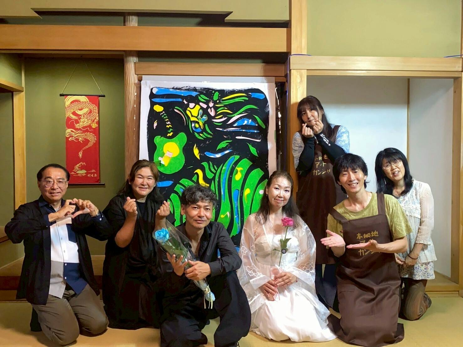 宍粟市にオープン予定の古民家カフェ「本拠地アイトカンシャ」。プレオープンの記念もあわせて、Hachiによるパフォーマンスを披露してまいりました!この白い画面から切り抜かれて現れたのは・・・会場となった「本拠地アイトカンシャ」さんへのお祝いの文字。黒、緑、黄、ピンク、水色の異なる色が重ねられたキャンバスに、様々な形の色が浮かんでは消えていきます、宇宙天画家・仁翠さんいよる歌と舞いが空間をサポート。また、作品完成後はふたりのアーティストによるアフタートーク・懇親会が開かれ、大盛況で幕を閉じました!ハリウッド出展やこれからの展望についてのつたないお話など、質問や暖かい拍手でお応えくださり、最後までありがとうございました!本日はクラウドファンディング二日目、引き続き宜しくお願い致します