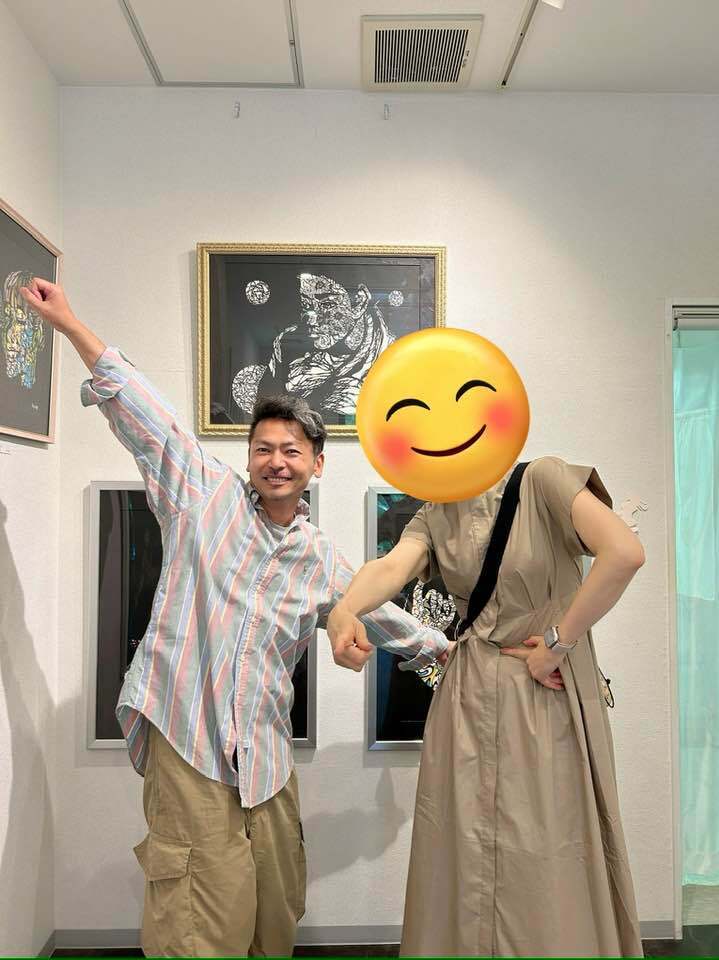 2025/09/23 07:39ハリウッドでの出展会場に参戦したわれわれアーティストメンバーは、Hachiをふくめ6名。それぞれに、現地在住の日本人通訳さんがついてくださいました。皆さん個性豊かなプロフェッショナルなガイド。(彼らをオファーするためにも出展料がかかったわけです)Hachiについてくださったのはネネさん。英語が堪能であることはもちろん、ご自身もアートを制作するのもあり、Hachiの意図することも瞬時に把握し、臨機応変に動いてくださりました。値下げに関する交渉のエピソード(LA日誌②参照)も、彼女なしでは乗り越えられなかったでしょう。Hachiの持参した「漢字一字の切り絵」も、来場者に丁寧にその意味を説明してくれました。そしてHachiの立役者がもうひとり。写真右の男、MASA。アメリカ在住、Hachiの同級生です!といっても、小学校のころ、3年生だか4年生の一寝年だけのクラスメイト。彼の転校後、30年近く交流はありませんでした。5年くらい前、姫路でのライブ切り絵の時にお客さんとして来てくれての再会。料理人として海外を渡り歩いている最中だったMASA。里帰りの際に会えたのでした。ファンキーな見た目の彼ですが、住まいのダラスから3時間かけて飛行機に乗り、手伝いに来てくれました!(今回一緒に出展されたアーティスト、マリアさんとともに)一日だけのTEAM Hachi。NYでの個展が実現する際には、また苦楽を共にしてほしいところです!本当に二人ともありがとうございました!! もっと見る